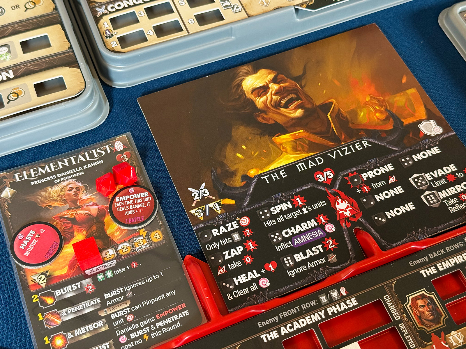 And then this giant battle commenced, with a messy mix of abilities to activate and dice rolls. I did a few neat things to defeat the Mad Vizier, but I only succeeded through luck.
