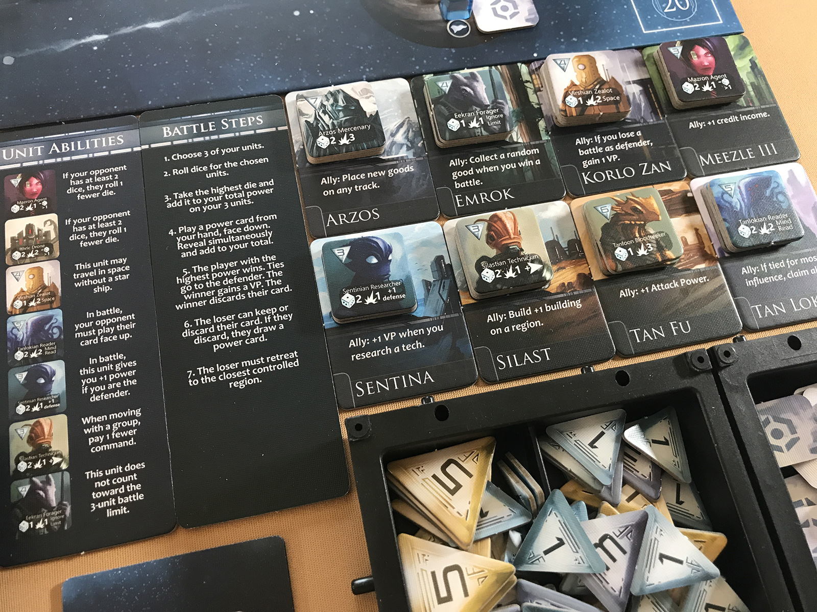Over the course of play, control over planets shifts while influence guides alliances and available recruits. Events and actions shape what happens across the many planets, while the solo variant introduces a pair of foes who create battle opportunities. Quite an ambitious design!