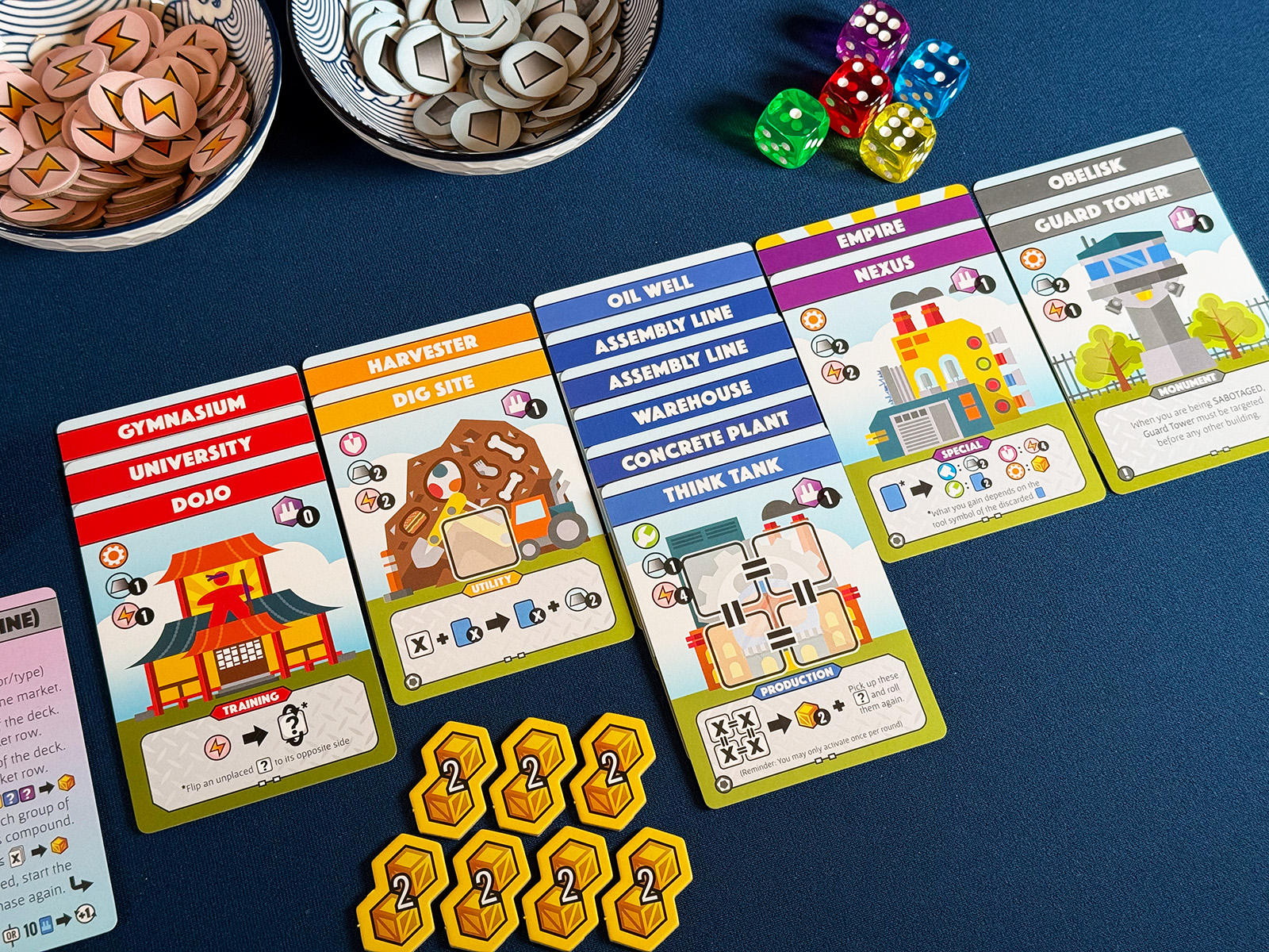 Stacks of buildings are sorted by type, and dice indicate if the solo opponent will produce at the end of the round. This ramps up later on, but random dice rolls are unpredictable.
