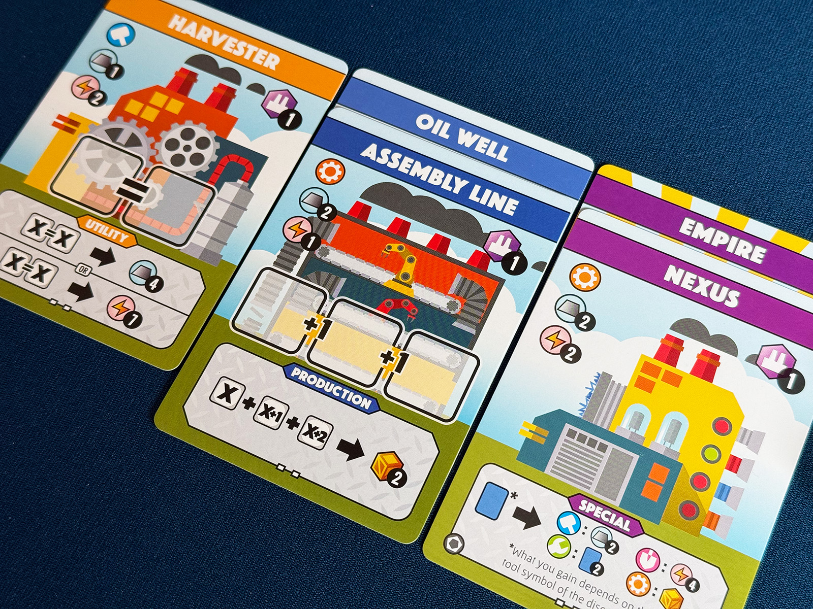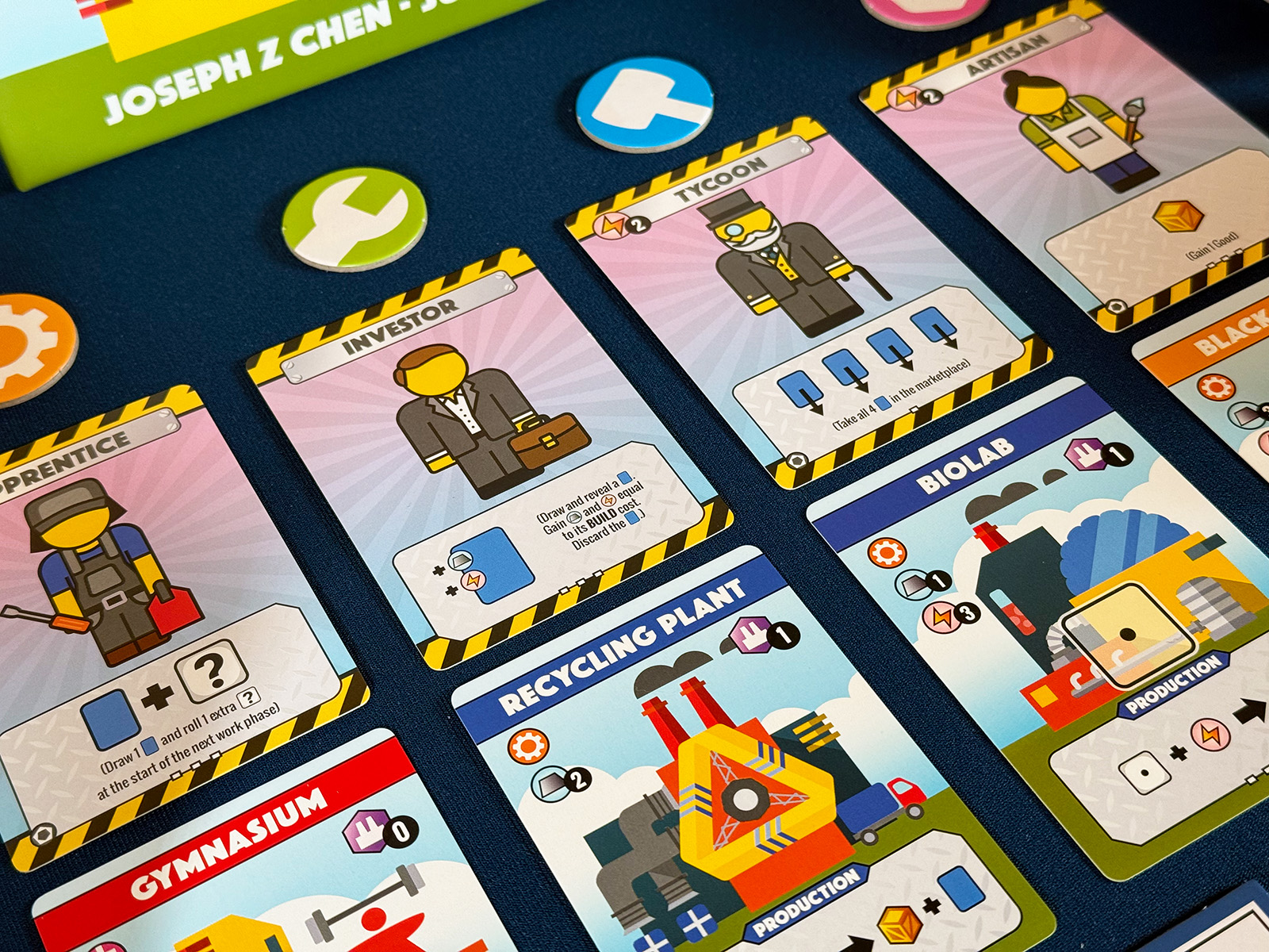 Buildings take shape and goods are produced. Workers are represented by dice, who might gather resources, pick up new blueprints, or activate unique abilities. So much to do! The solo opponent is simple enough to manage, and finding useful building combinations can be quite interesting!
