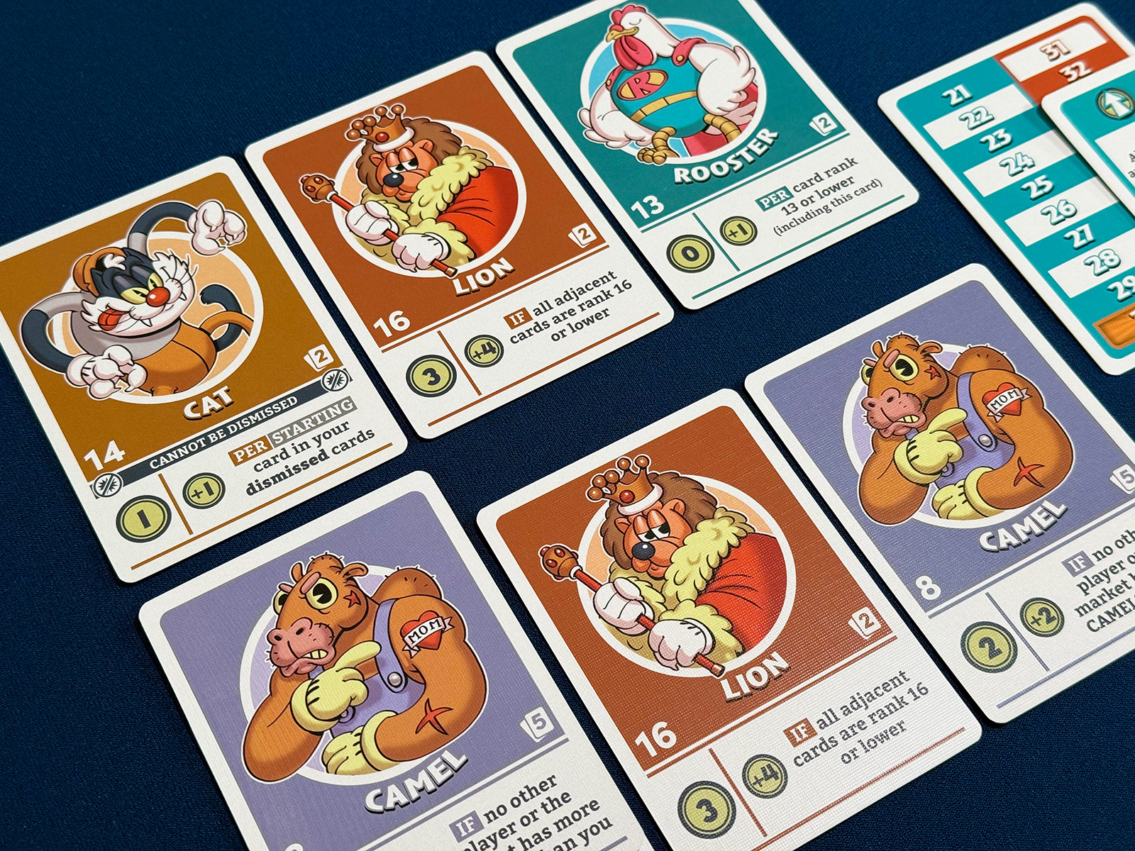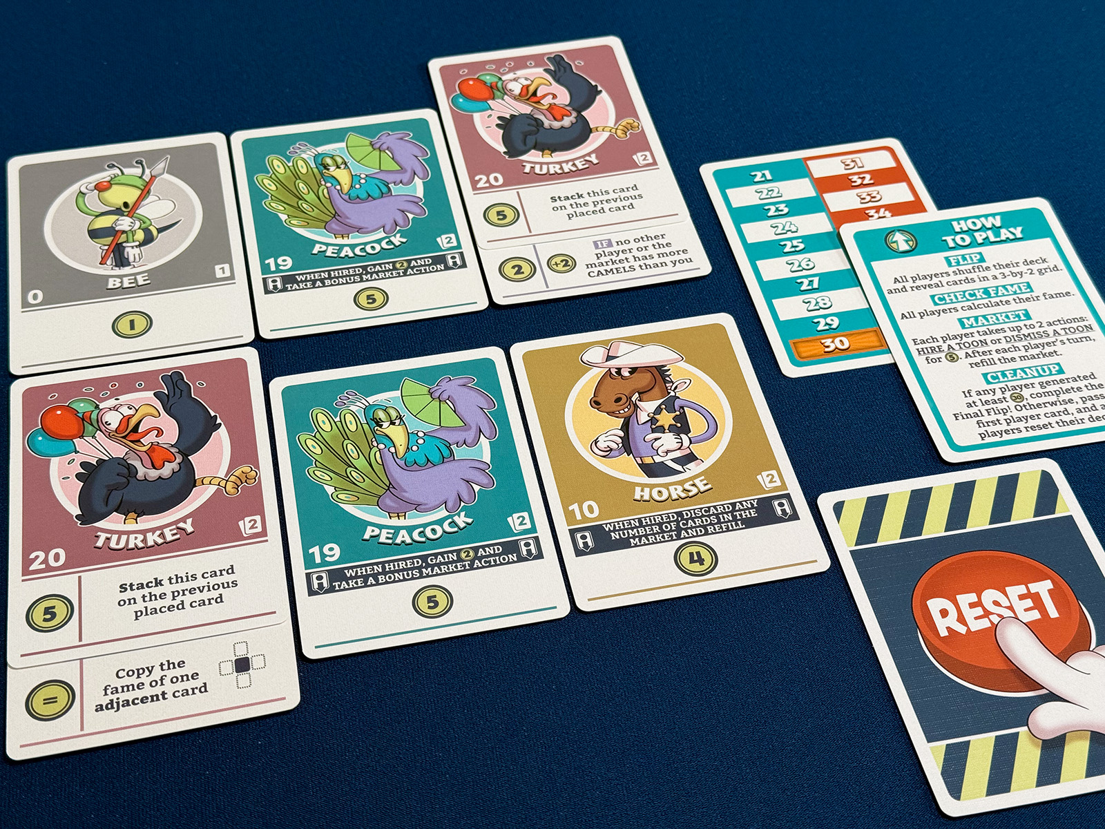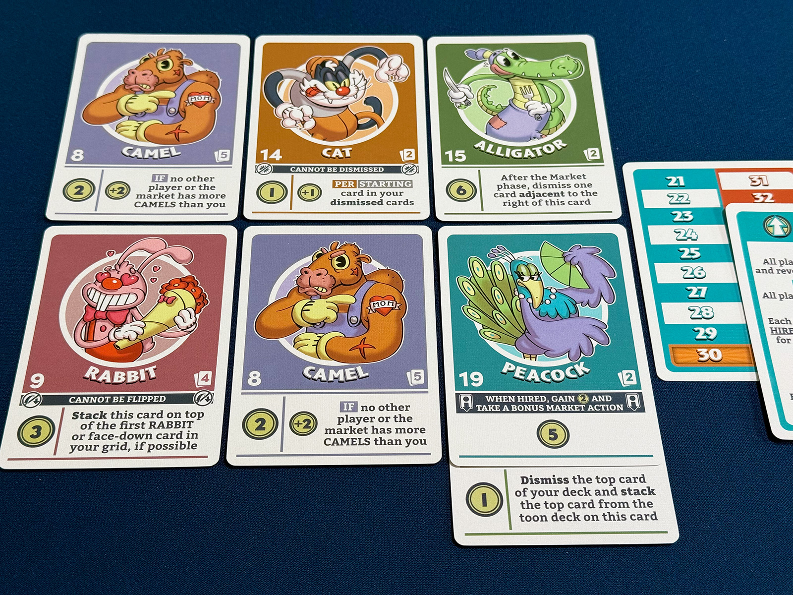 With the flip of the cards, characters appear with their own ways to earn fame. However, only 6 may be hired, so it’s a clever balancing act of adding and dismissing the right cast of cartoon animals. Reaching 30 victory points before the central deck might seem easy… But that’s not all, folks!