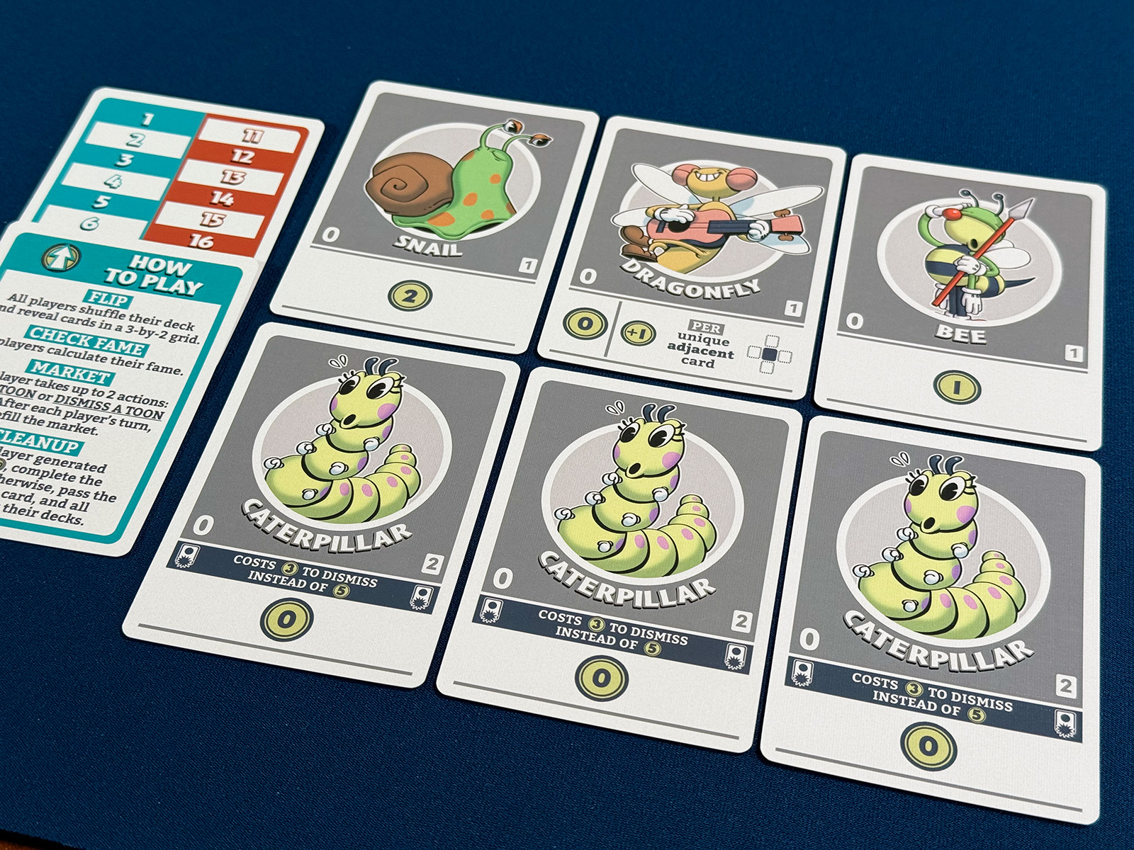 The rules are very straightforward and involve flipping 6 cards in a grid, counting up fame, and then deciding how to spend anything that doesn’t cross the victory threshold.