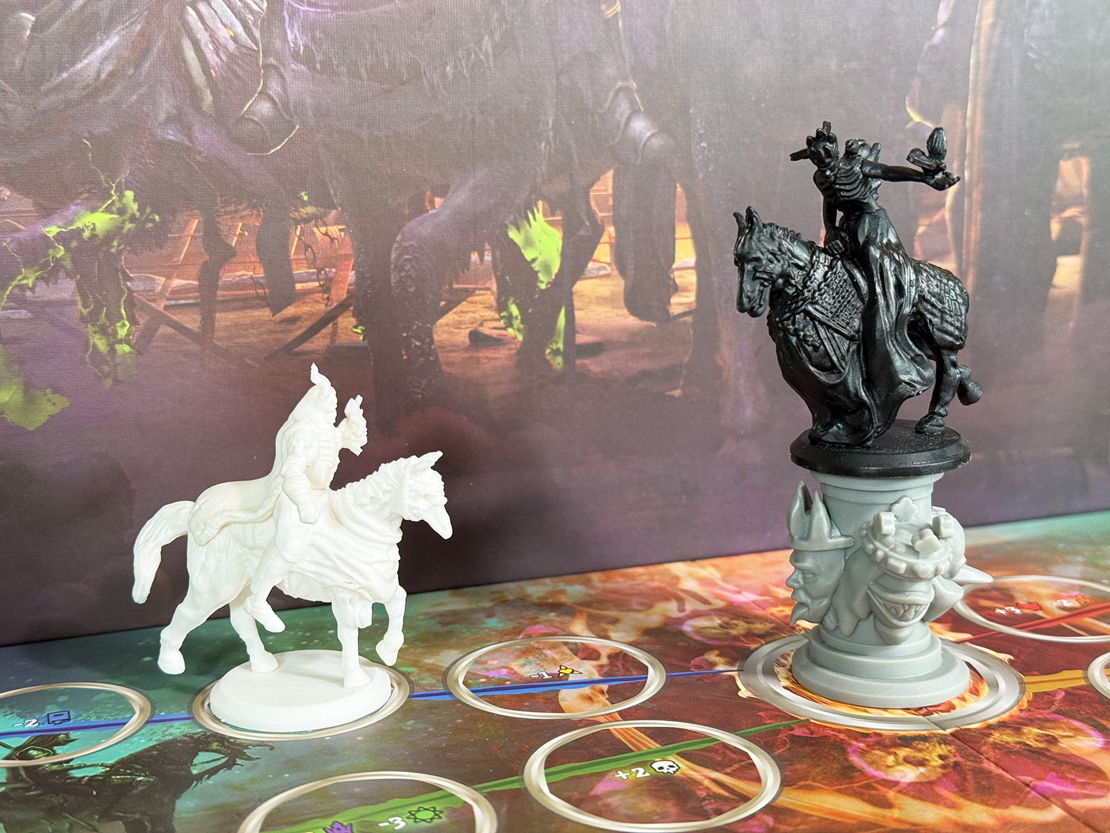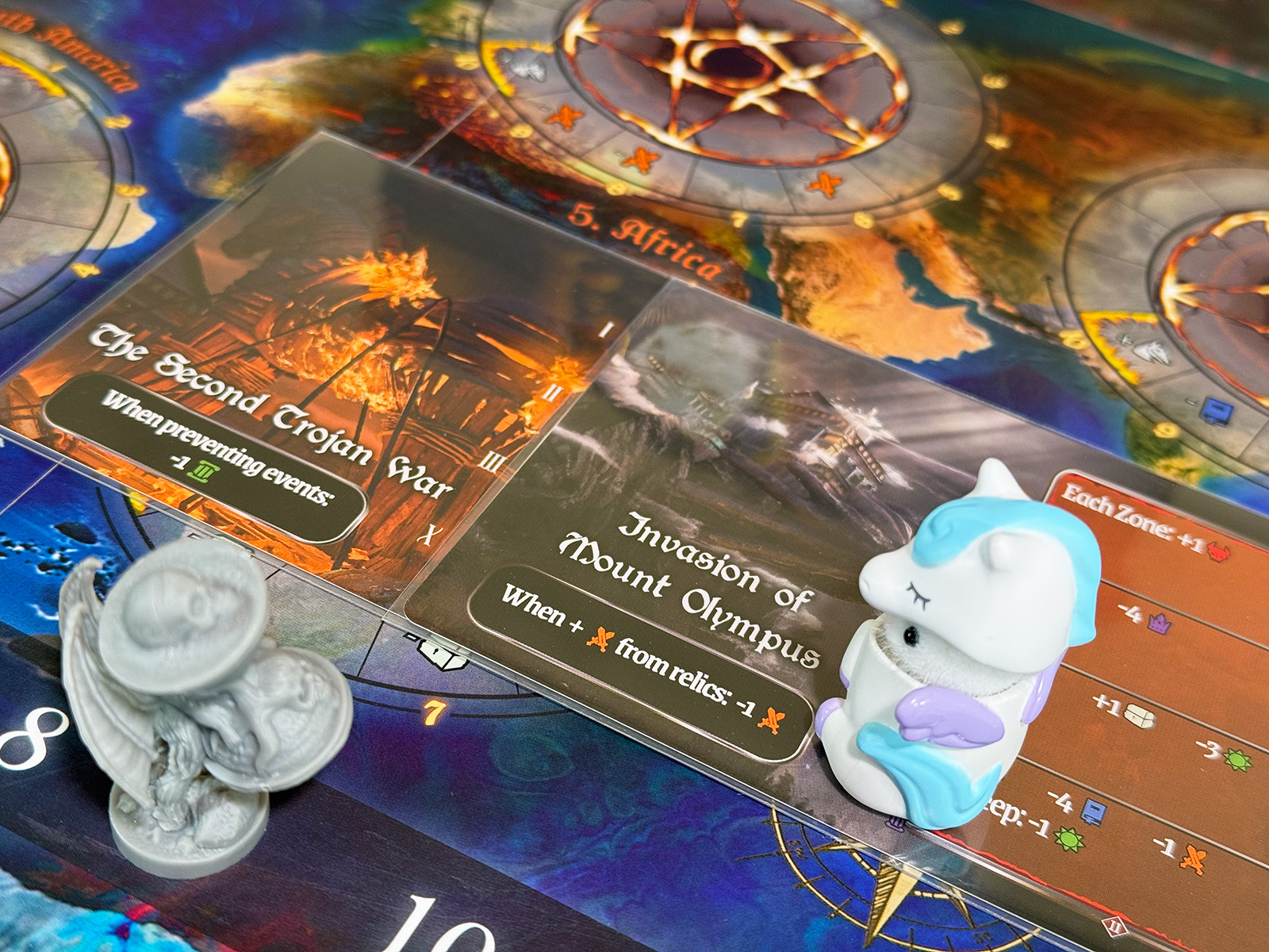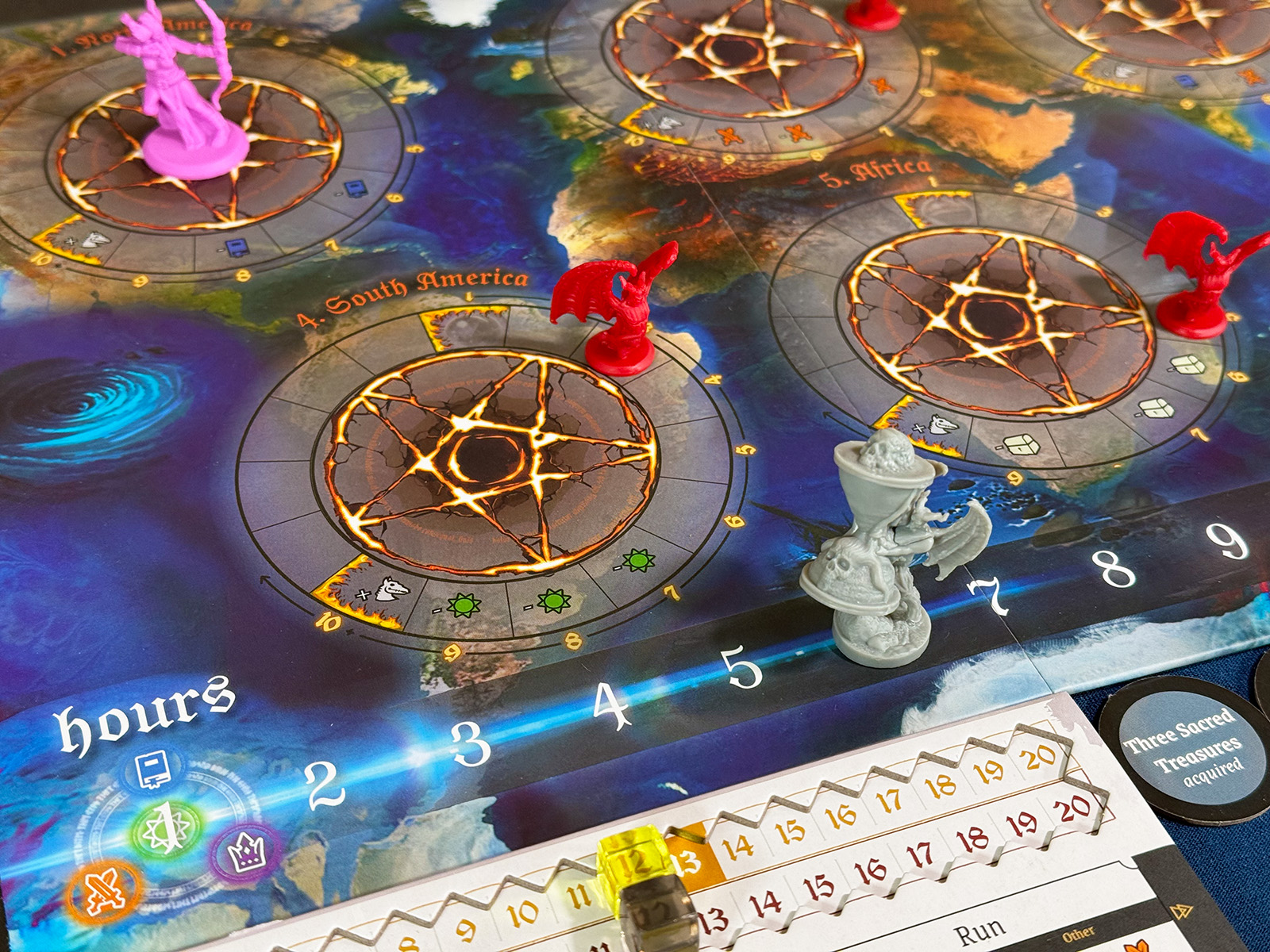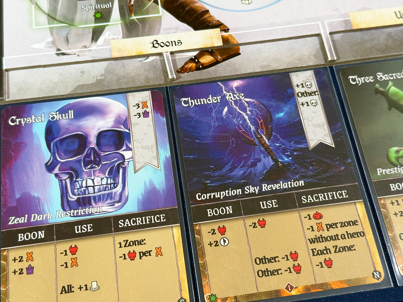 My favorite part of this system are the relics, which can be used in different ways. Each one has a different ability, depending on which column it’s placed in during a turn.