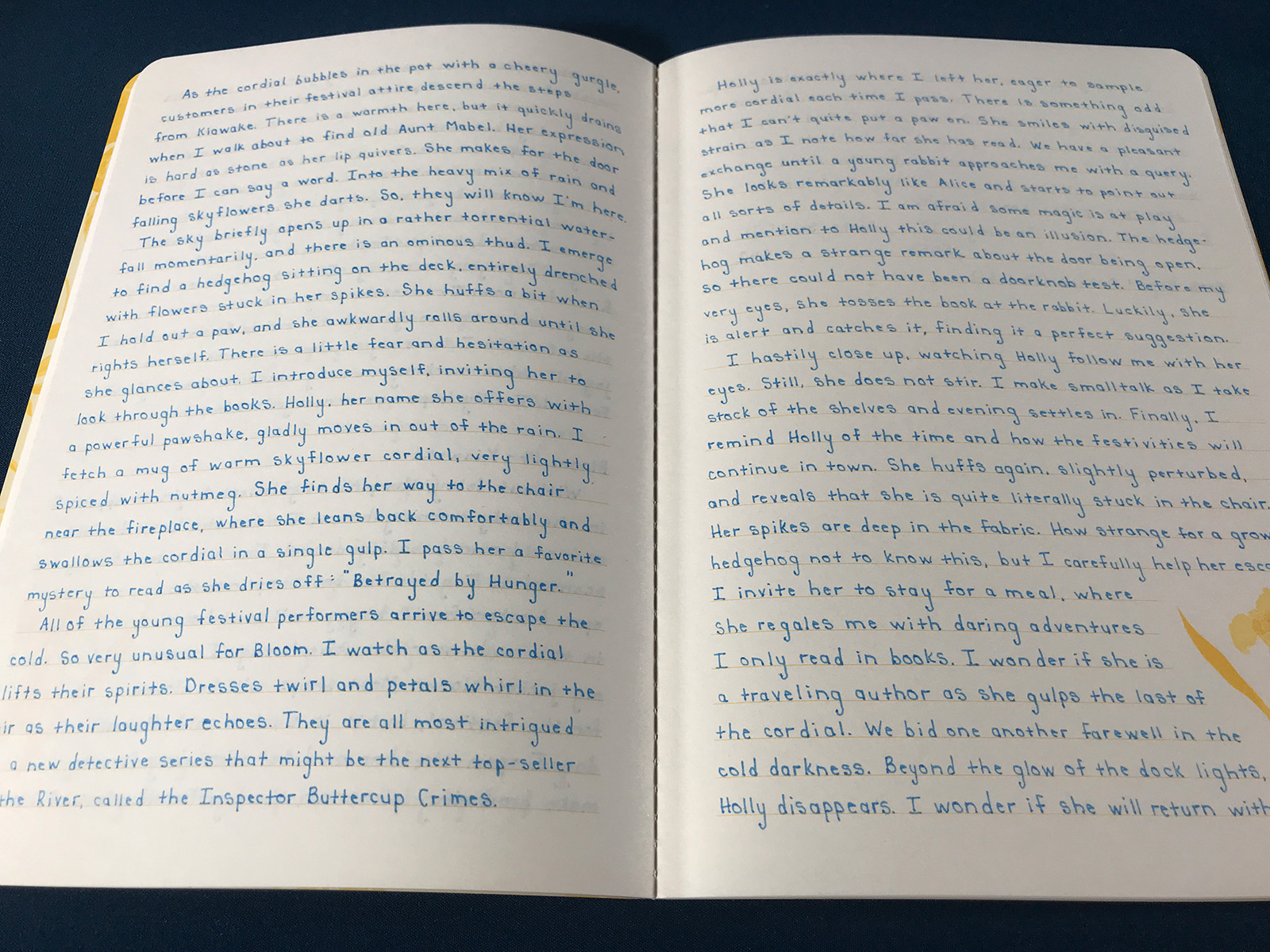 All of the young festival performers arrive to escape the cold. So very unusual for Bloom. I watch as the cordial lifts their spirits. Dresses twirl and petals whirl in the air as their laughter echoes. They are all most intrigued by a new detective series that might be the next top-seller on the River, called the Inspector Buttercup Crimes.