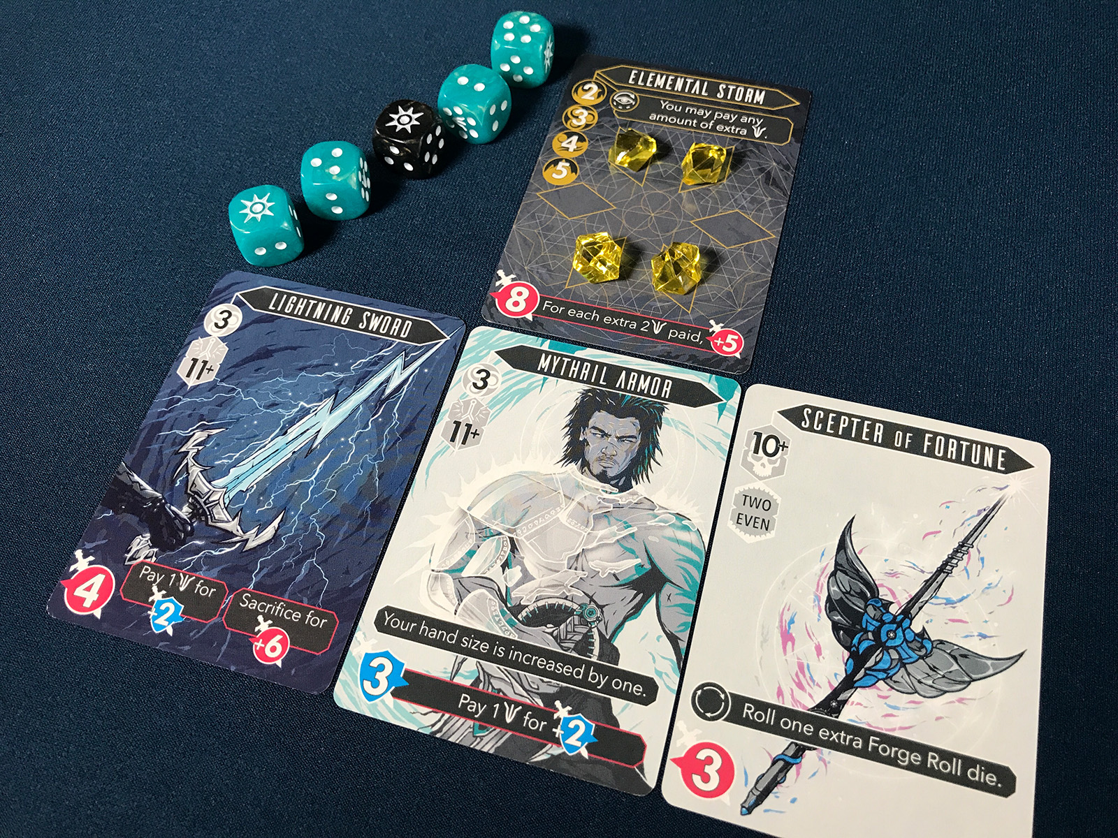 Different creations and spells offer attack, defense, and special abilities. Each turn, dice provide the values that may be used to put these cards into play. The goal is to survive longer than the solo opponent. With some turns that feature 20+ attack damage, it can move very quickly!