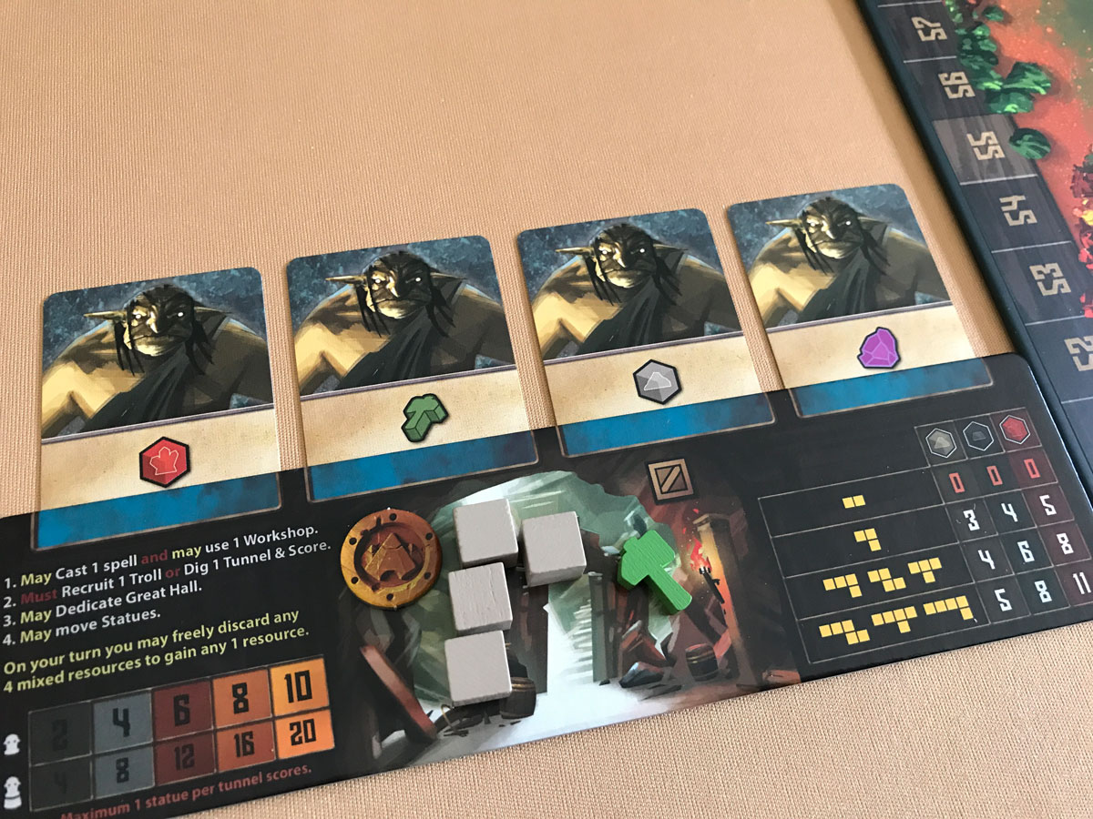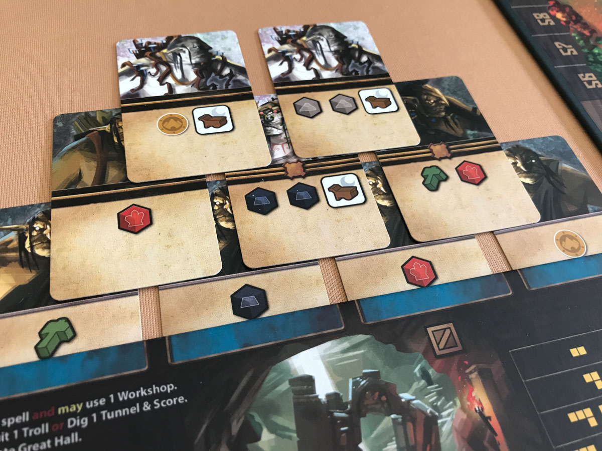 But the cascades get better! For either of the trolls in my upper row, they triggered cascades for 6 cards. Neat, right?! Since this is the main way to collect resources, it becomes very challenging to figure out which trolls to recruit, when to recruit them, and where to place them for the most needed resources. This was another design choice I enjoyed a lot!