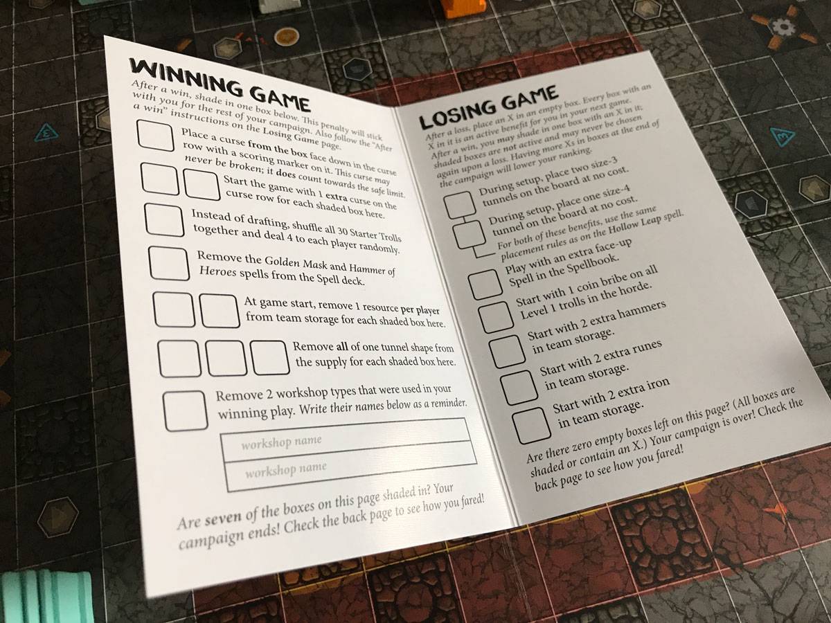 The expansion includes a clever campaign ledger to track progress over about 7-14 plays. Wins provide obstacles, while losses make the game just a little bit easier.