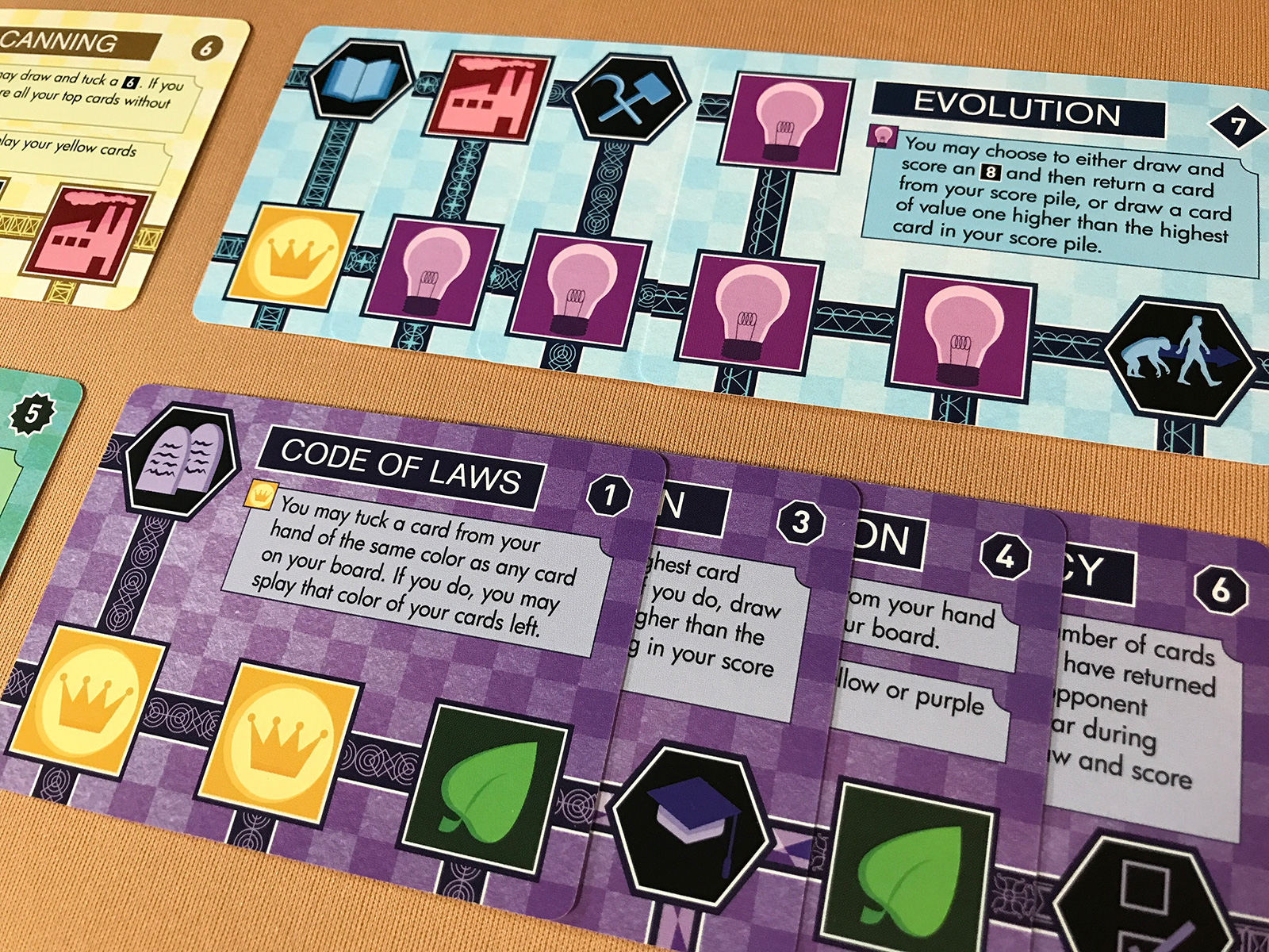 Evolution catapulted me ahead during this play. I was quite proud of all the splayed cards, too, which helped to add up symbols. Splaying abilities are always awesome!