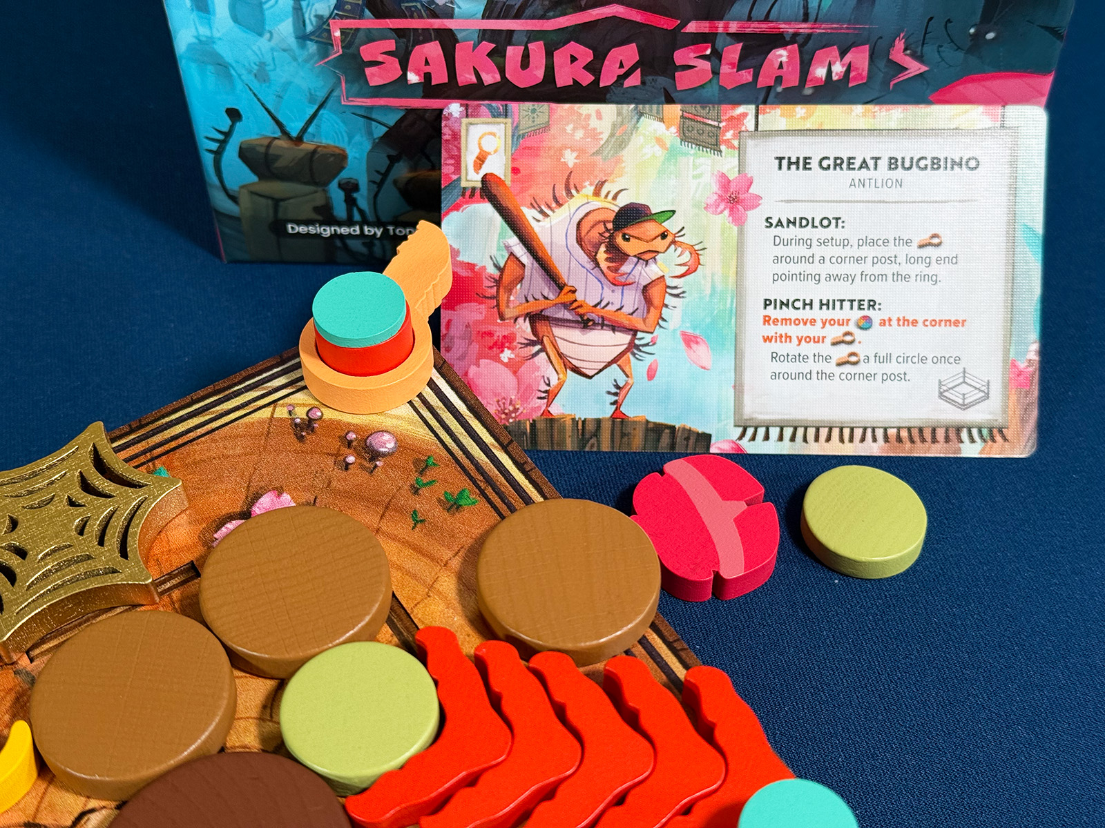 Not ready to close the door on wrestling insects, I moved onto Kabuto Sumo: Sakura Slam to see if I might modify an unofficial solo variant to work with it. The main difference is a square ring with corner posts, although all of the insects offer up some neat signature pieces of various shapes! Another match was on as I got to work puzzling things out…