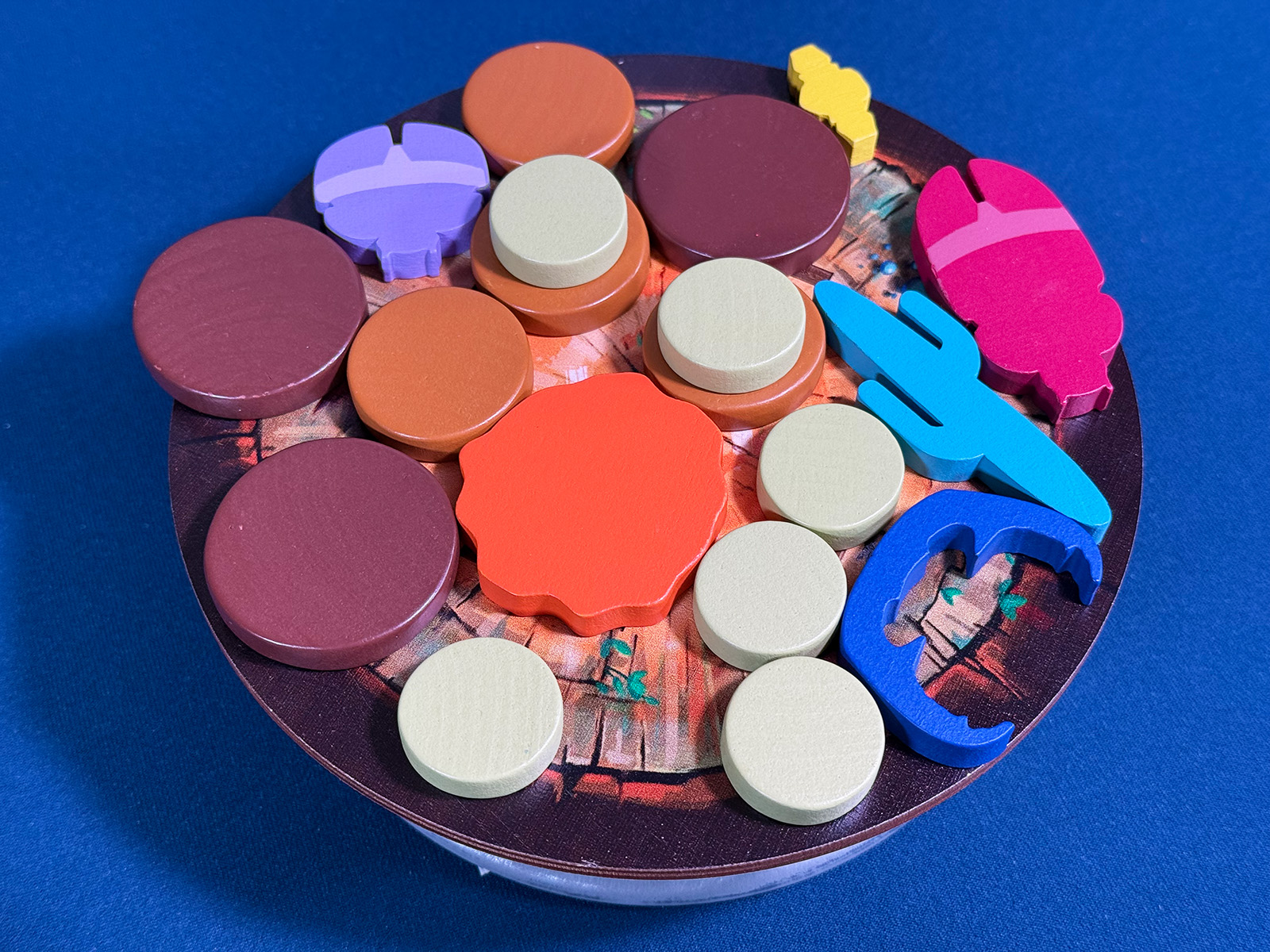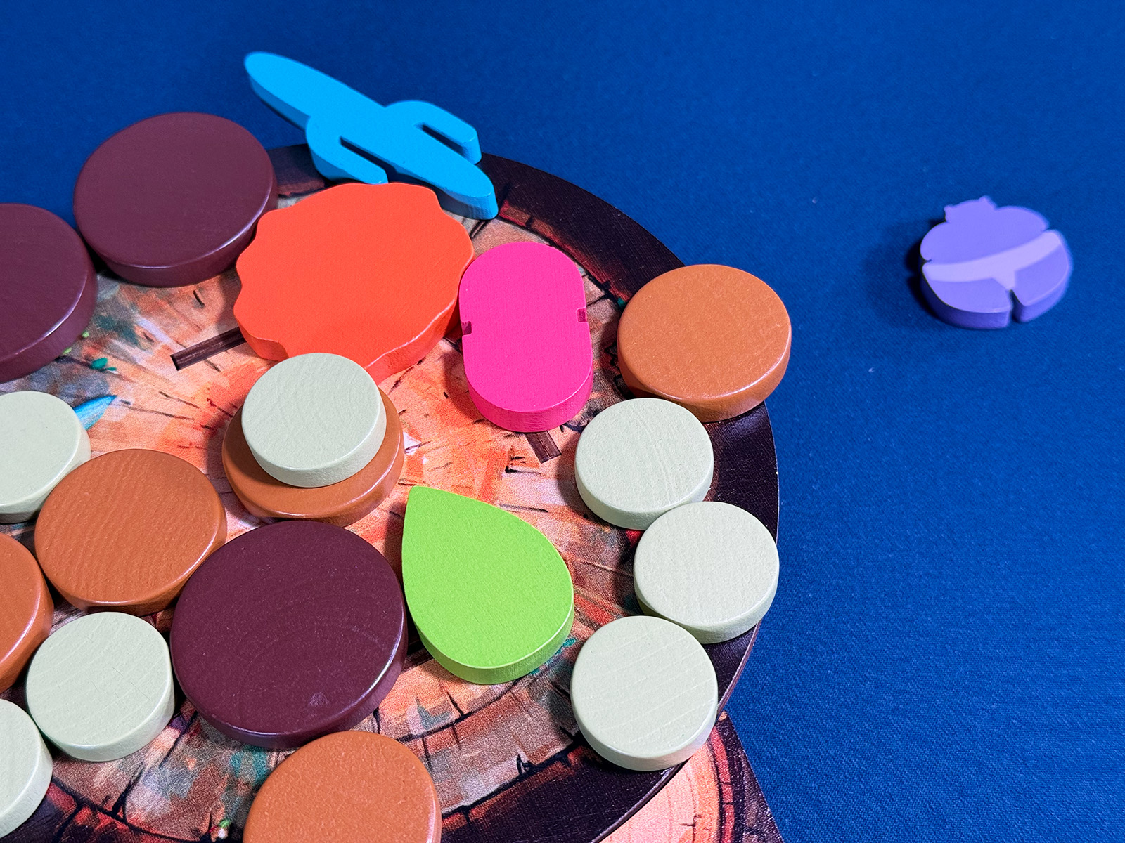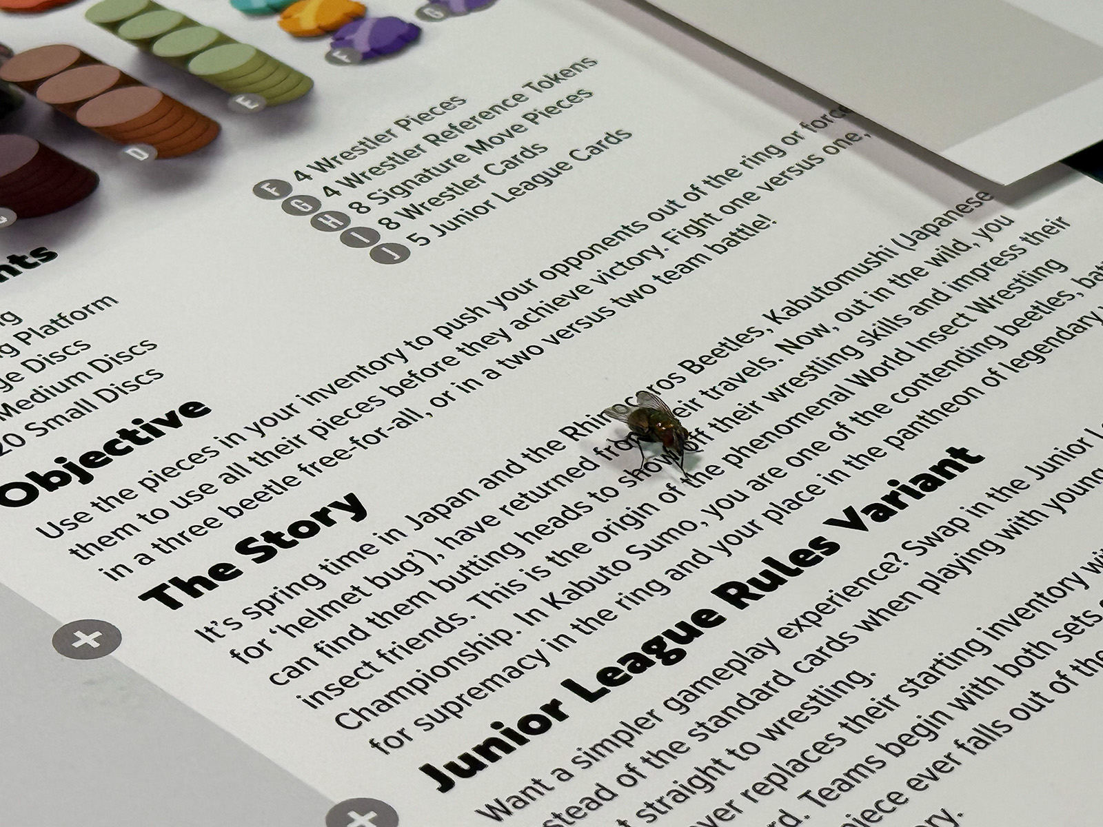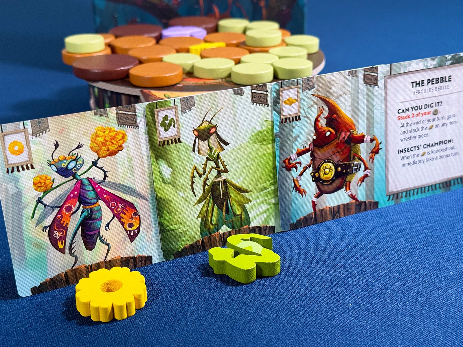 A starting setup fills the ring with discs and a central beetle, with the goal being to knock it out before running out of pieces! Delightful insect characters can enter play by spending discs rather than pushing them into the ring. Getting the physics just right is quite a fun challenge!