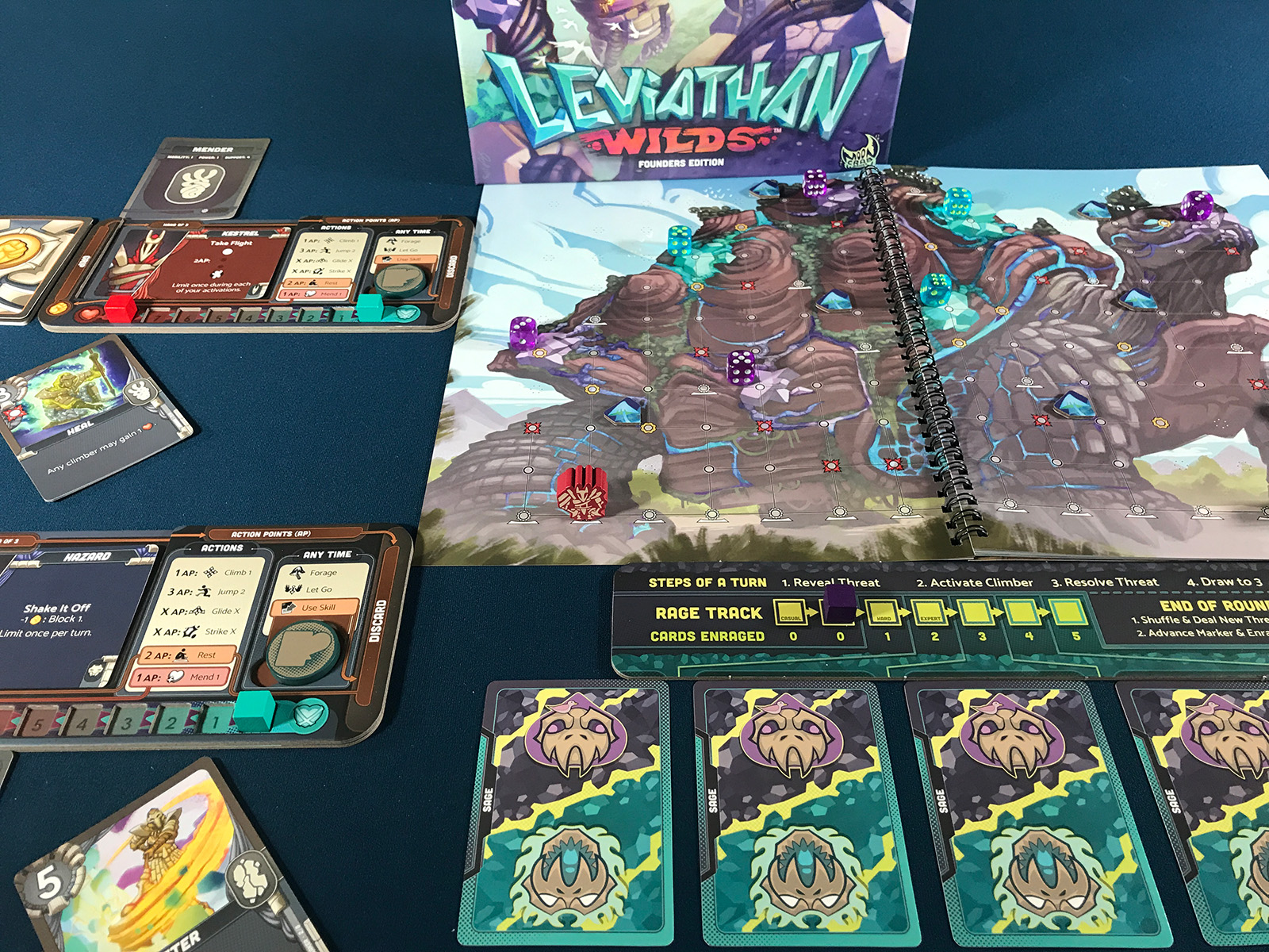 Unique climbers use multi-purpose cards to climb a chosen leviathan with its own set of skills and paths. Binding crystals must be destroyed to heal it, all while rage builds and challenging threats arise. Action-packed turns make for exciting victories and narrow escapes!