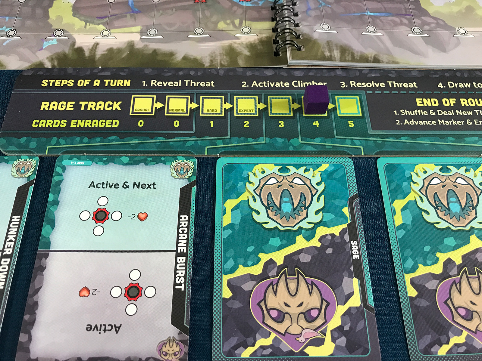 Enraged threat cards are more dangerous. In this example, both climbers may lose health instead of just one of them.