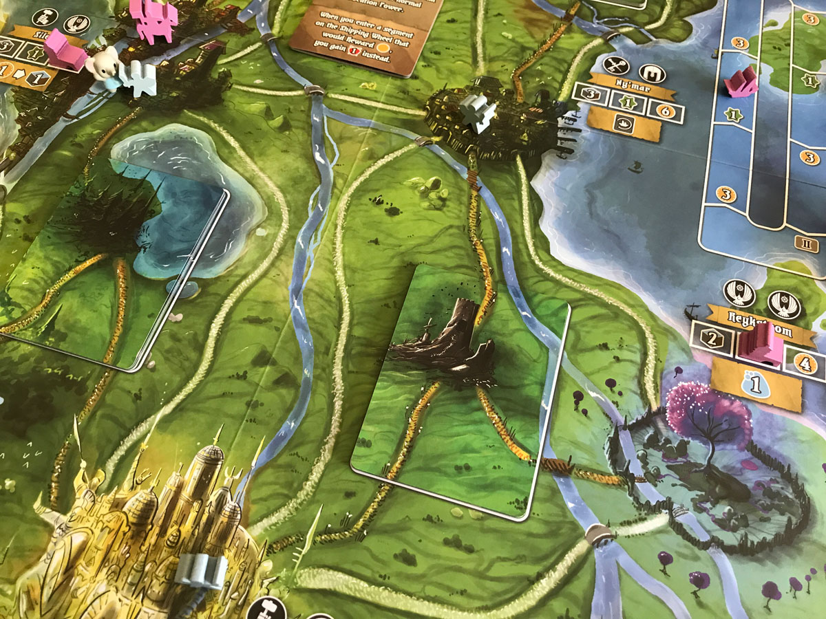 A beautiful and large set of boards made for a fitting backdrop as I got started. This time, I used some of the exclusive card packs to add more variety to the monster pools. With just 2 per lair, it seemed nice to switch things up. I collected my starting resources and bonuses, and then it was off to get those ward towers constructed!