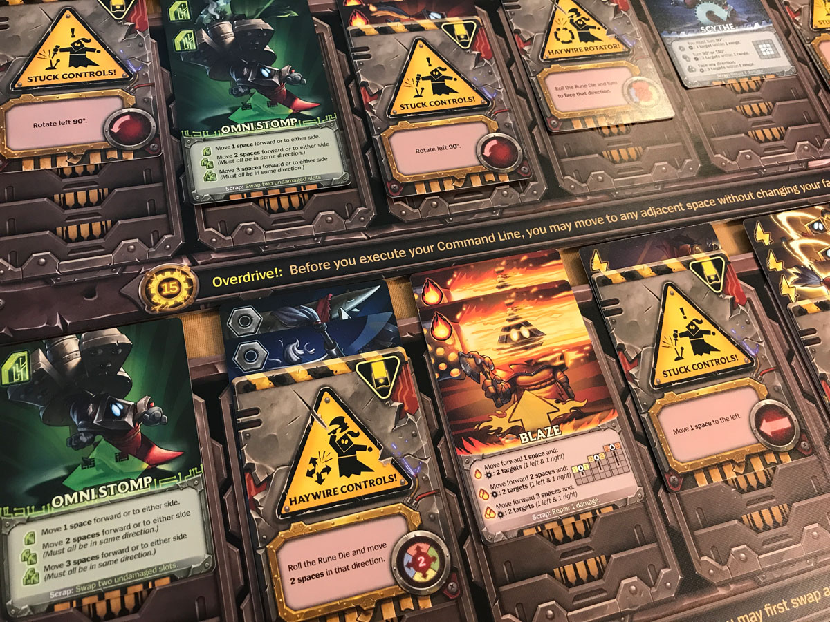 To my delight, this mission introduced the boss and a component I hadn’t expected: Another command line. The boss begins with basic commands in every slot. These must be activated in sequence, just like what happens with a mech. However, the final part of the boss’s turn involves choosing 1 of 2 drawn command cards to place in its matching slot.
