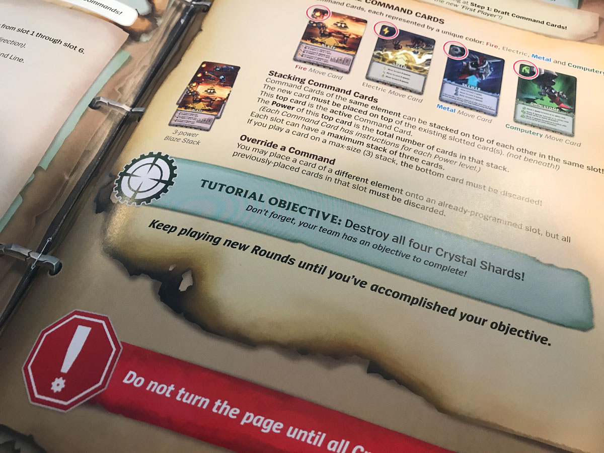 Command cards can be placed individually, while those of the same type may be stacked to grow more powerful. Actions might include moving, rotating, or attacking.