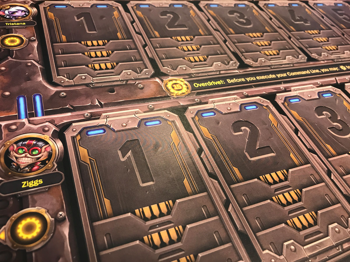 The bulk of gameplay centers around the 4 different Yordles inside the various mech suits. Each one has a play area to stack command cards and program a sequence.