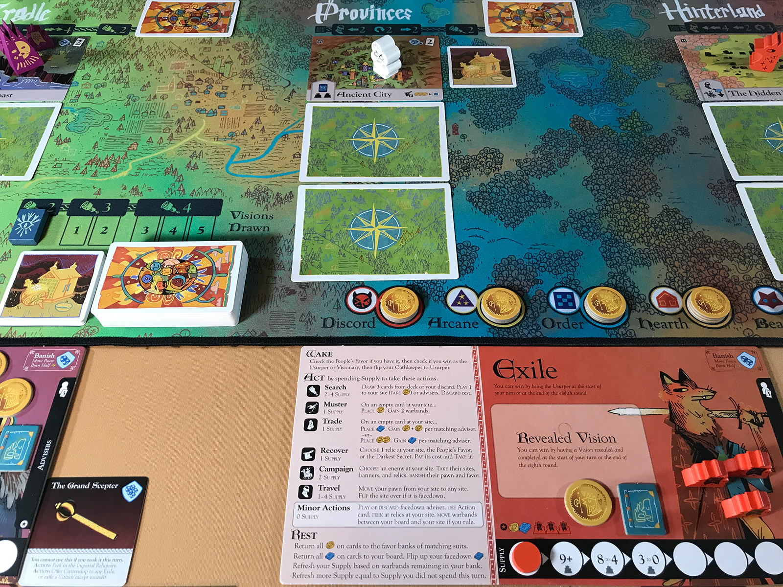 Consider, though, that sub-optimal choices often benefit the Chancellor. Thematically, this likely gives the ruler a little advantage in maintaining that power. In my mind, this all worked out accordingly! It felt like the exiles couldn’t work together to coordinate their efforts. Effectively, they were split up against an already powerful Chancellor.