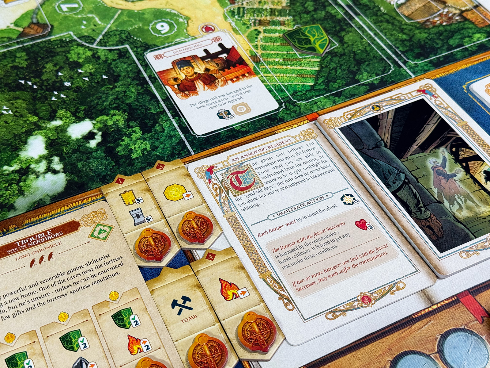 Let’s just say that this final chronicle required building a tomb for the resident ghost, and I nestled it between the barracks and dungeon. Seemed about right for what we learned about the ghostly presence. Ha ha! I really enjoyed returning to this one. The variety might seem limited with the chronicles, yet there are many other small elements that make each play a different challenge. Go, go Rangers!