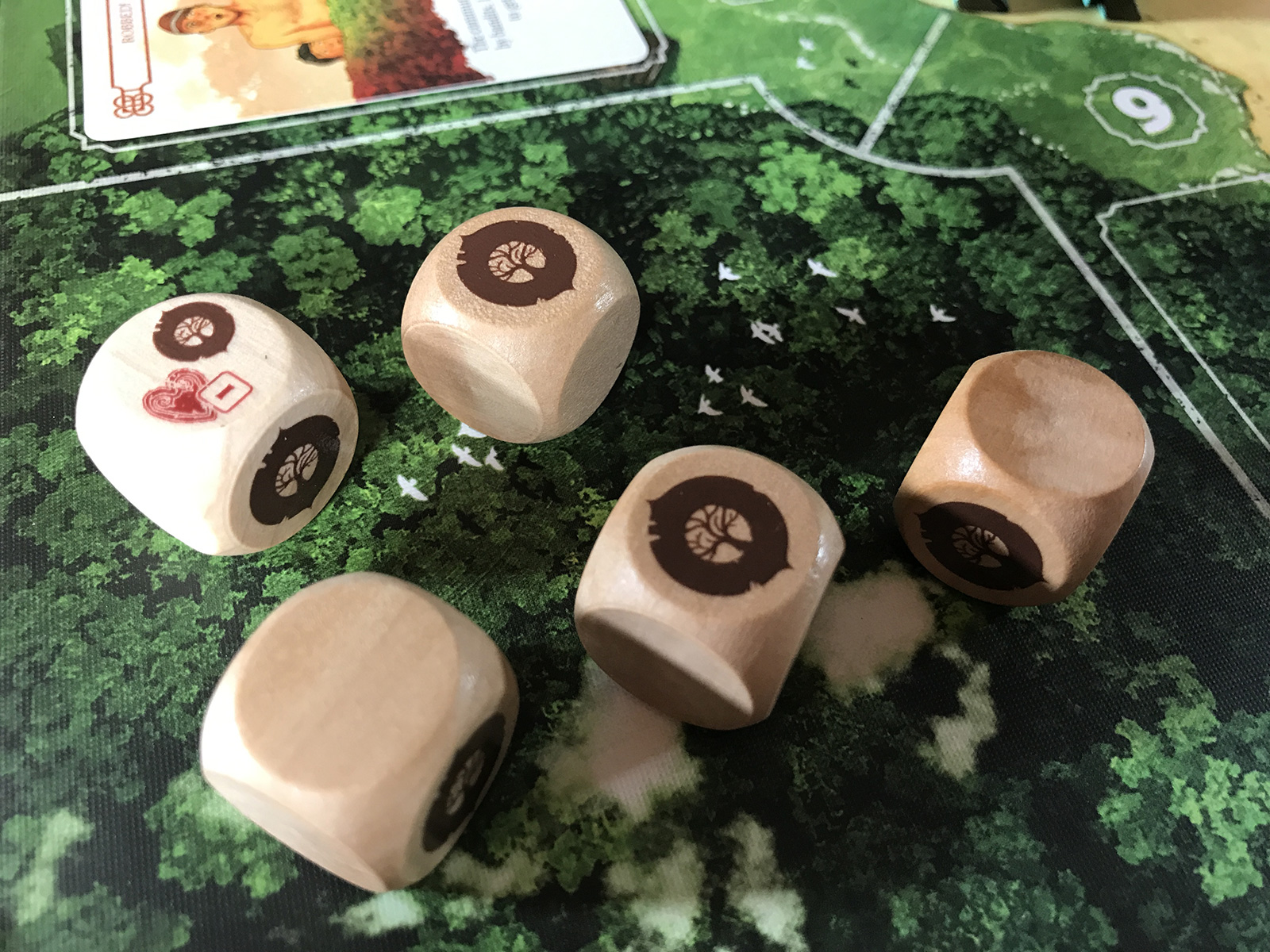 Most situations come down to rolling up to 5 wooden dice. More lovely components! But that does mean that luck plays a big role, sometimes going in the wrong direction.