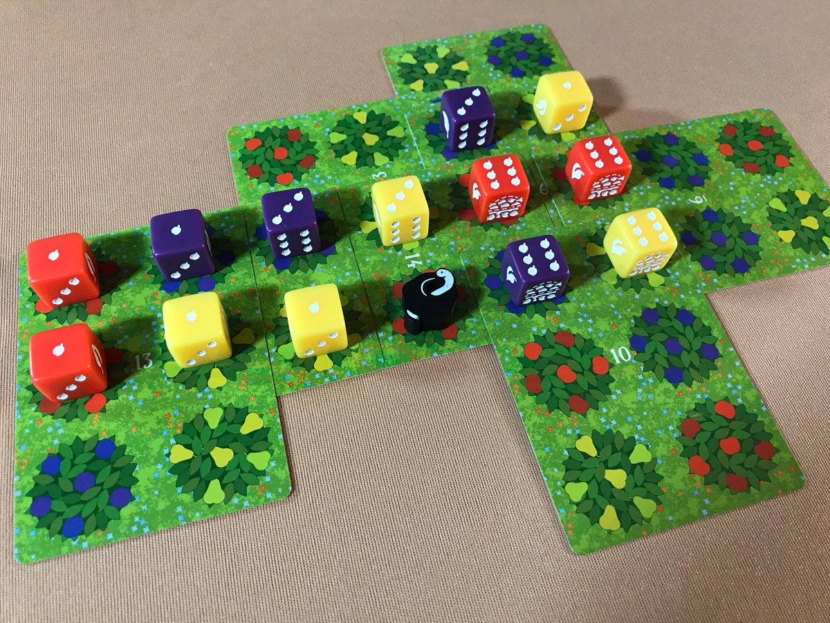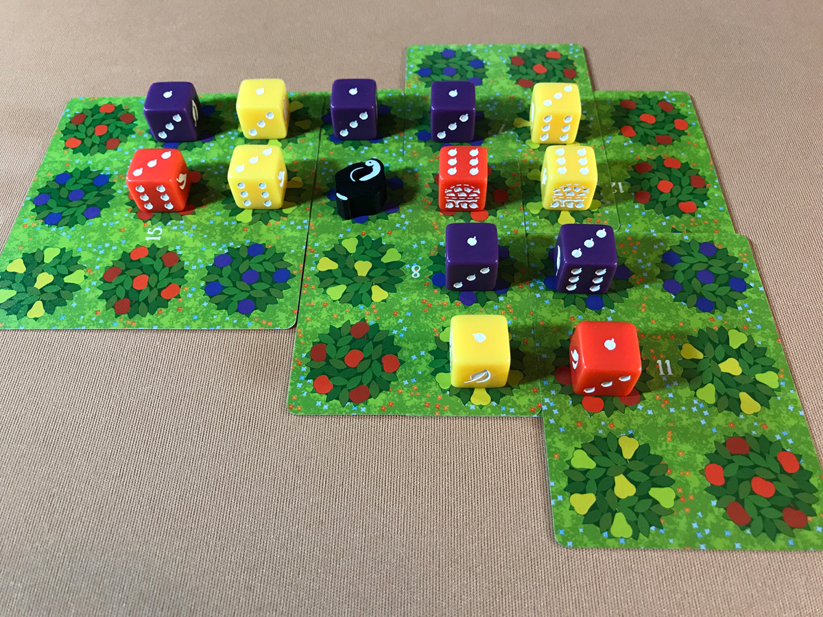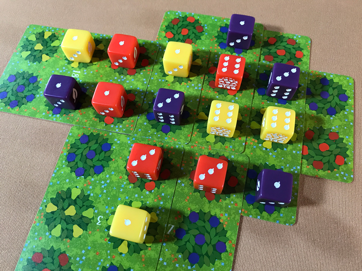 As cards are drawn and matching fruit trees overlap, dice provide a way to count how bountiful the harvest will be. It’s easy to understand how to overlap identical fruit trees, yet in practice, the challenge is quite amazing! Don’t forget to watch out for the rotten fruit worms, too!