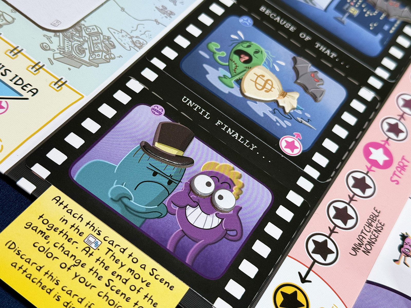 In the first expansion, genre tokens create a sort of requirement for a movie to count as a victory, regardless of its quality. This is a strategic challenge involving setting up scenes and possibly even swapping out these tokens. Ah, but it doesn’t stop there! These tokens are small enough to fit on the scene cards, and I had way too much fun customizing the cards.