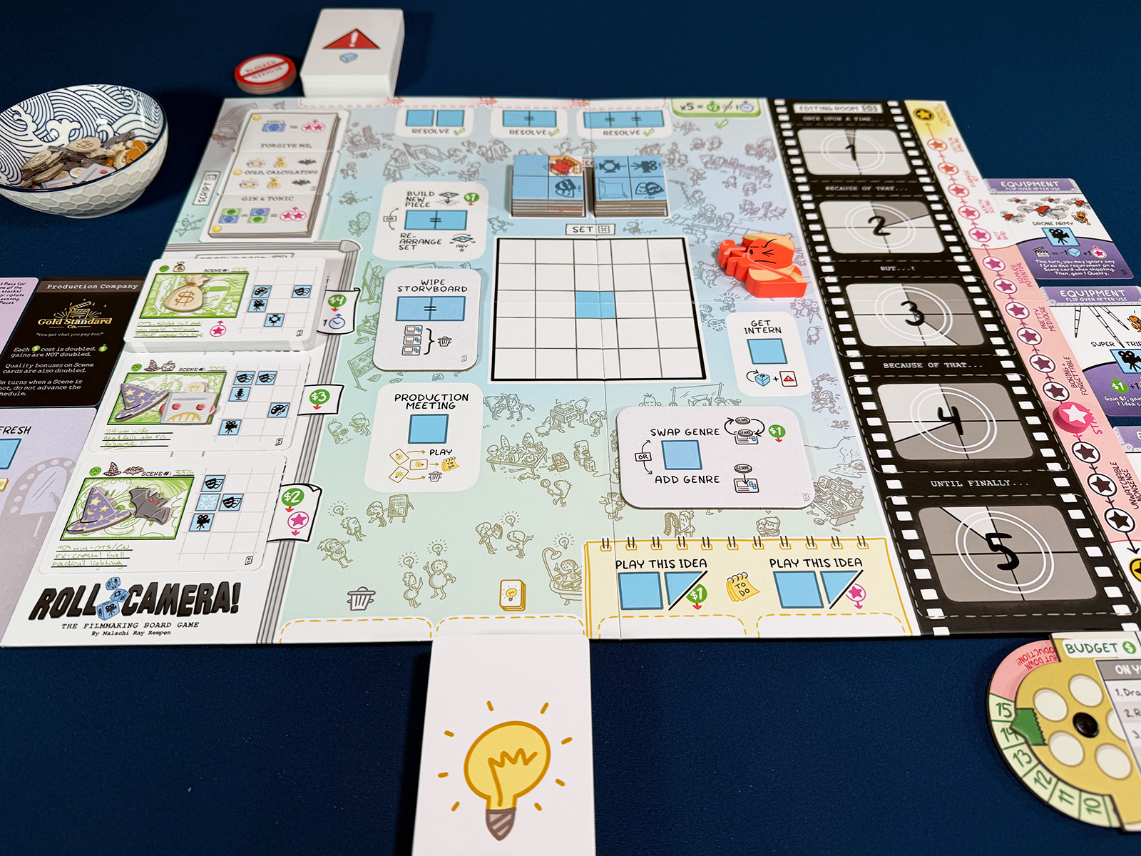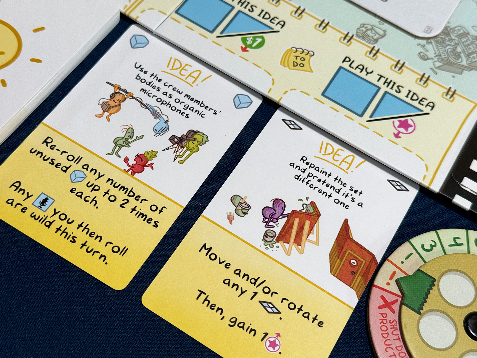 With a variety of actions, dice are used to work on what looks like a simple 5-scene movie… But problems abound! Production issues must be dealt with, often with clever ideas. And managing a budget and schedule? Just another day in the studio with delightful bean-shaped characters!