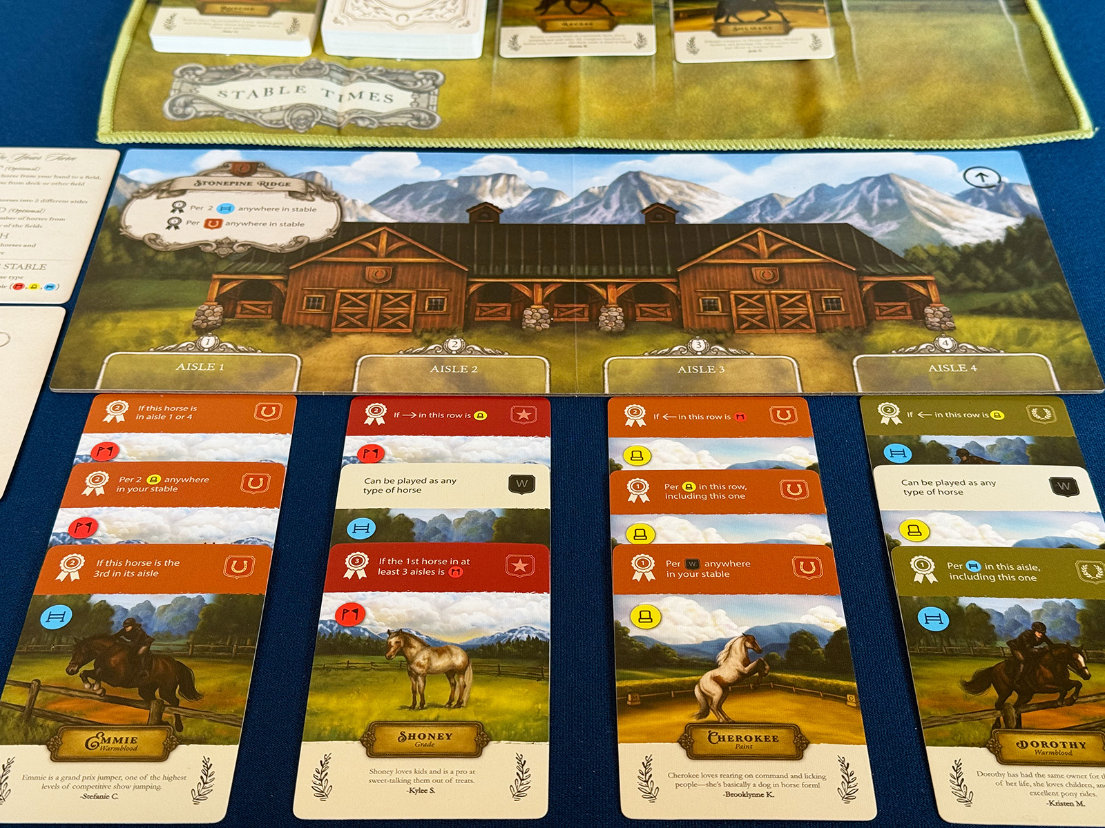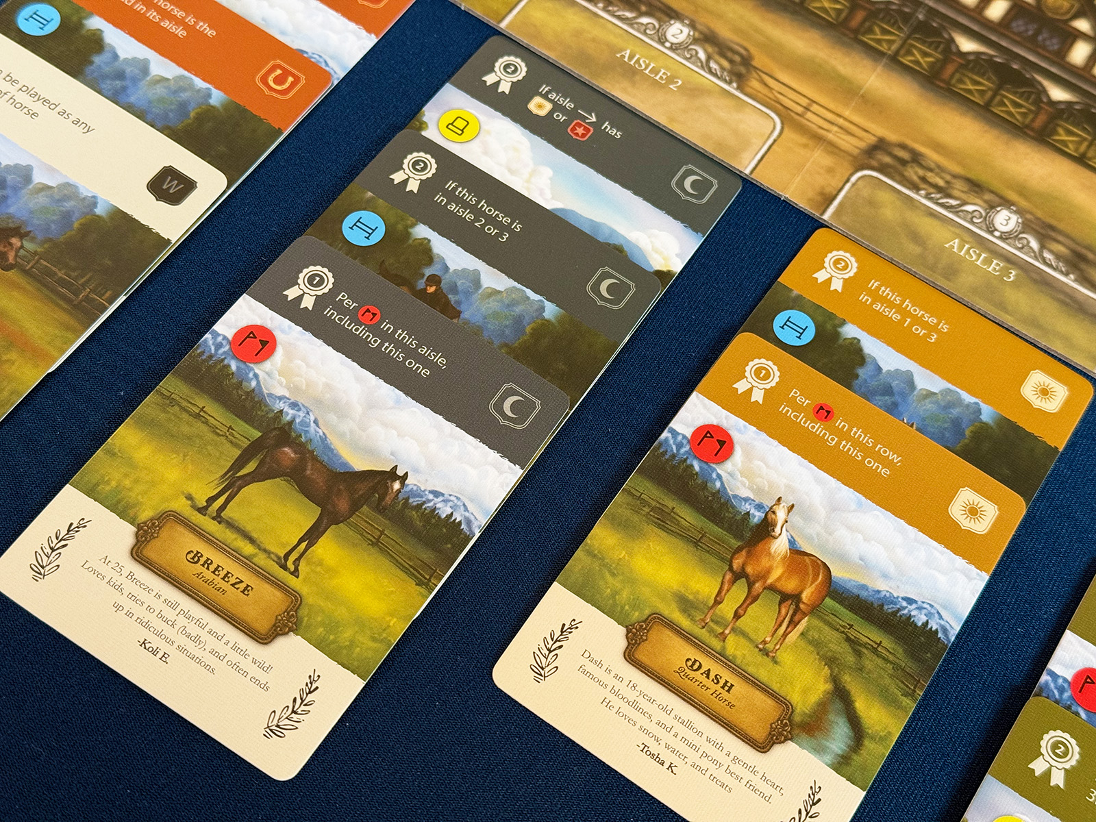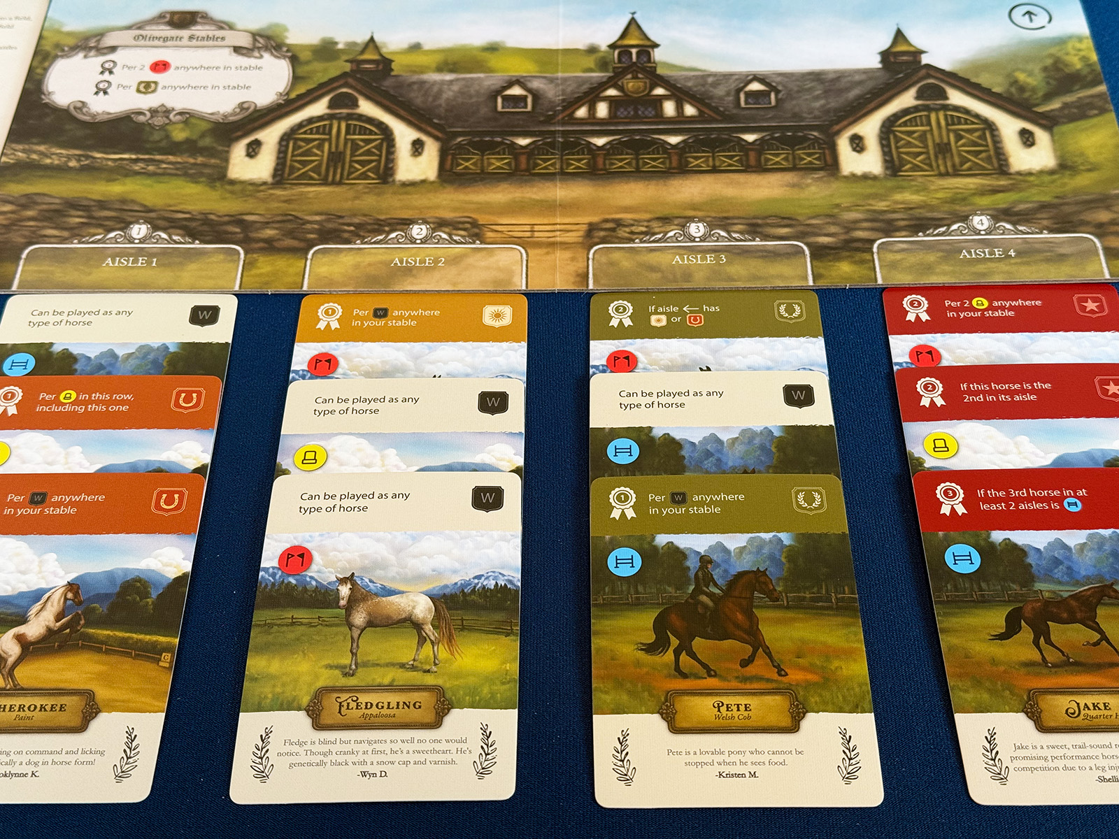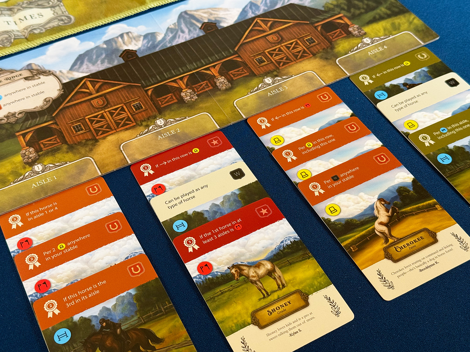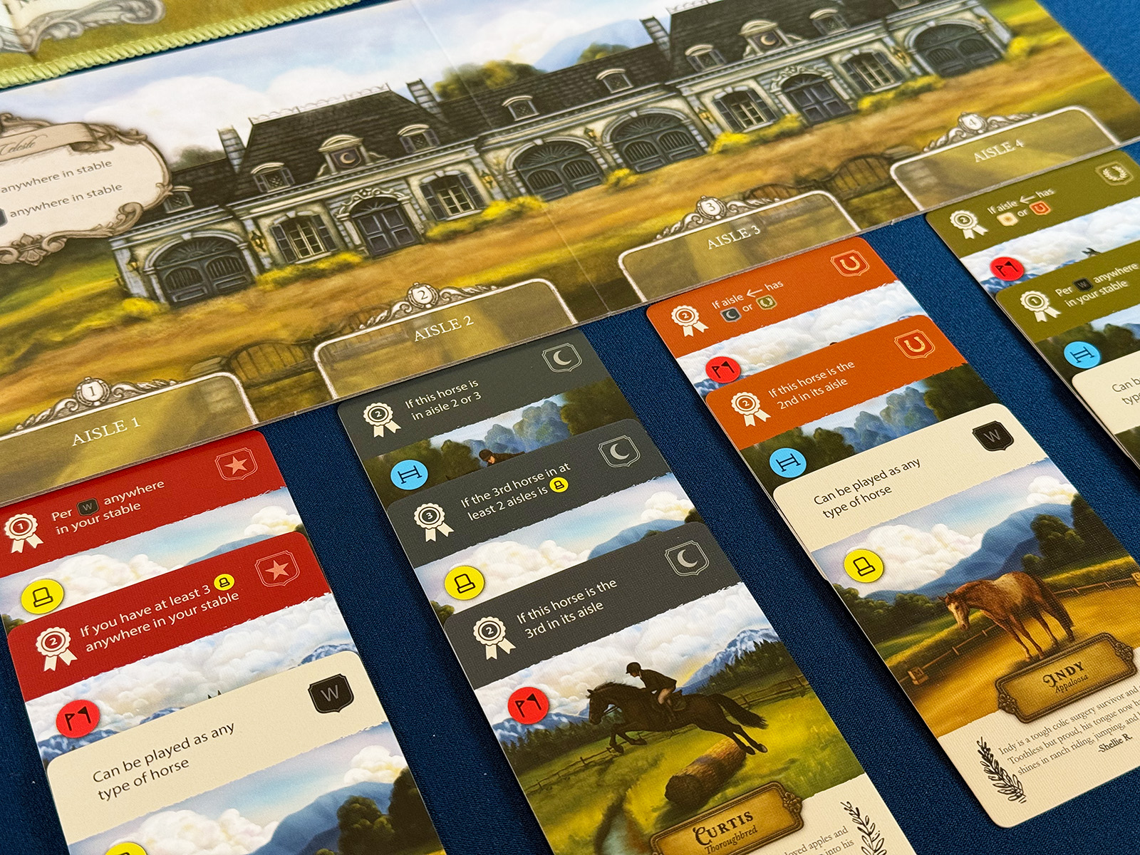 Turns involve placing up to 2 horses in the aisles, which get locked in by suits. Different scoring conditions create options, and upgrading the barn was a fun moment!