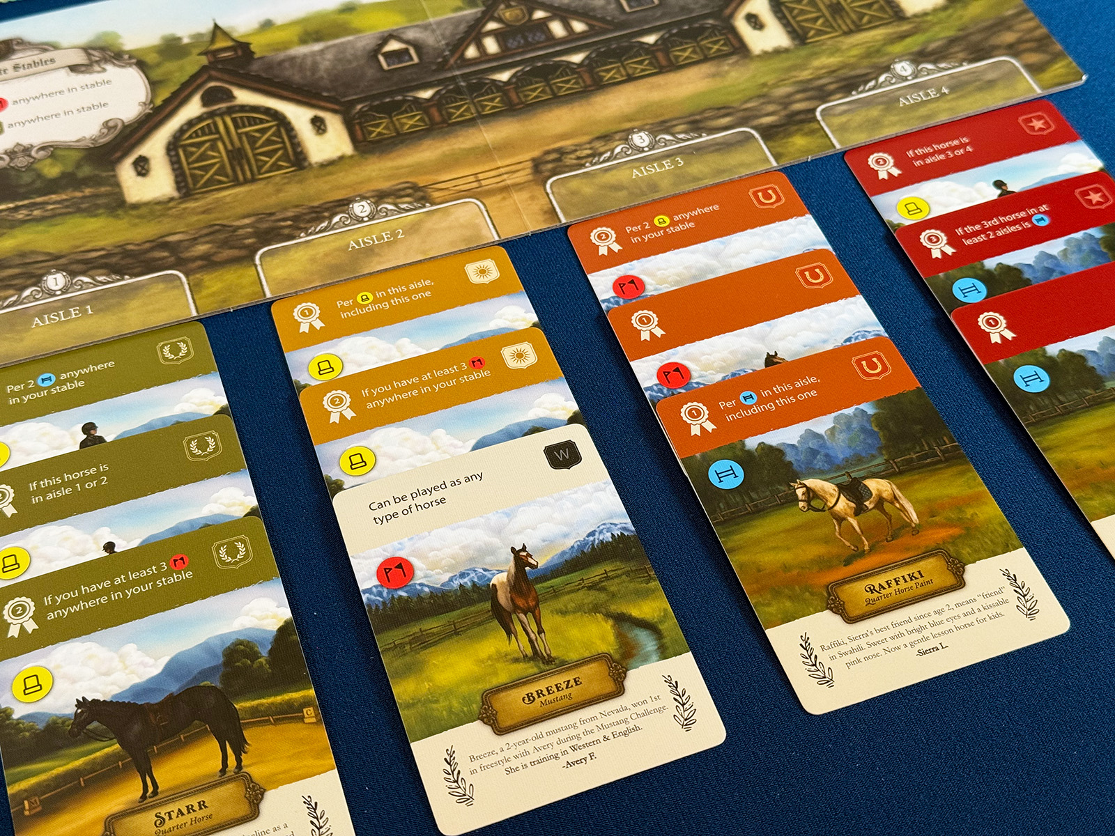 The goal is to fill up 3 or 4 aisles in the barn with various horses. Different scoring conditions and suits create opportunities and challenges. Choosing which horses to gain also takes on a little spin with those in the fields. It’s a very quick and thoughtful experience. So many horses!