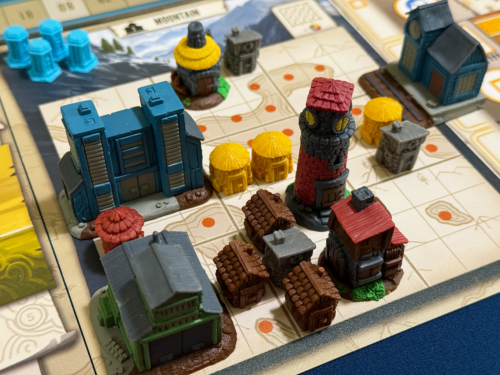 Income buildings come from a player mat and might seem somewhat standard, yet I enjoy coming up with little stories. Like the farms watched over by a lighthouse.