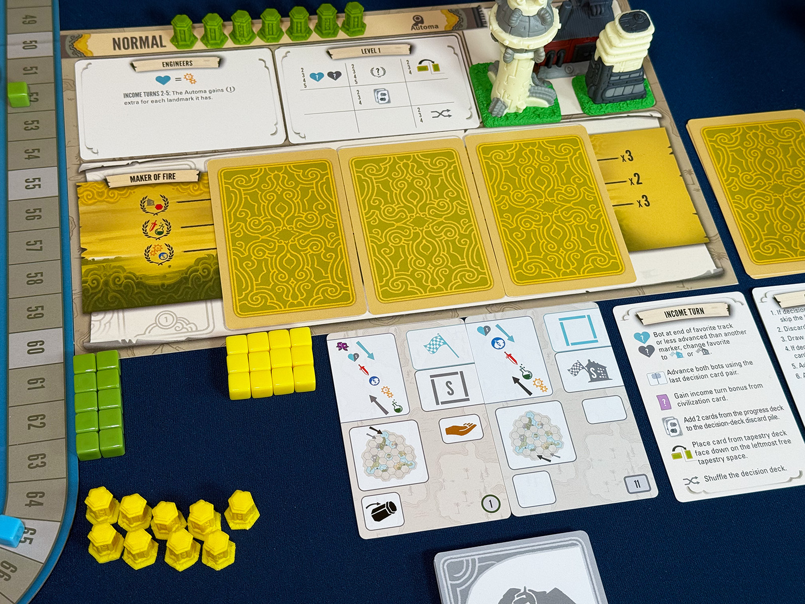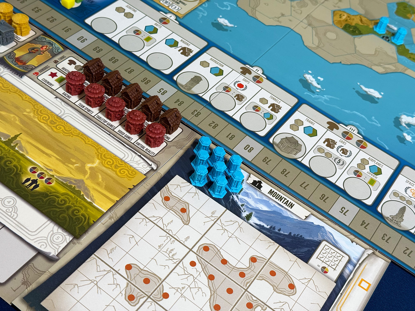 The solo mode involves managing what feels like 1.5 solo opponents, yet it works very well. A pair of cards shows the ways to advance along tracks each round. Very easy!