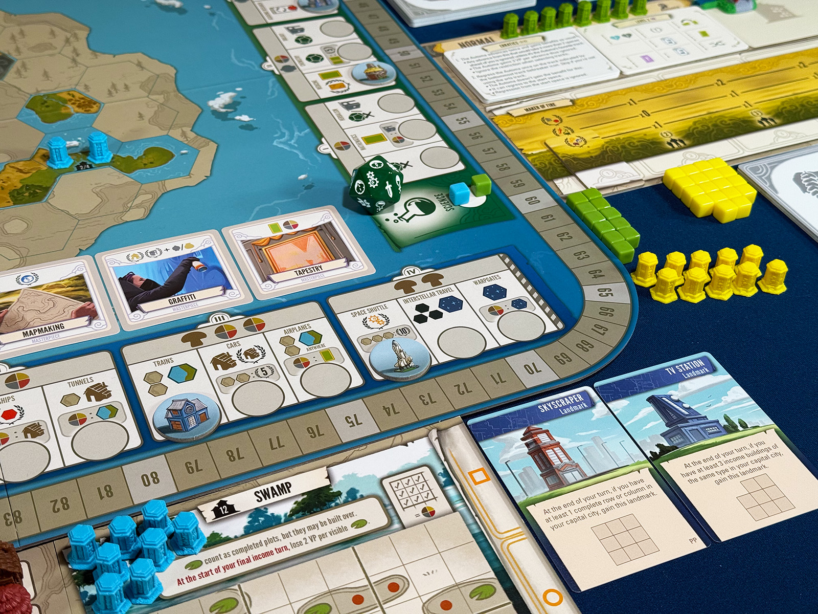 I set a challenge before myself in Tapestry… Not only did I increase the difficulty level of the solo opponent, but I mixed in all of the expansion content. All of it! That made for a lot of new concepts, although I was excited to see the new cards and landmarks! Right away, I found a hilarious movie tie-in, and the battle was on to keep a castle standing up in the swamp…