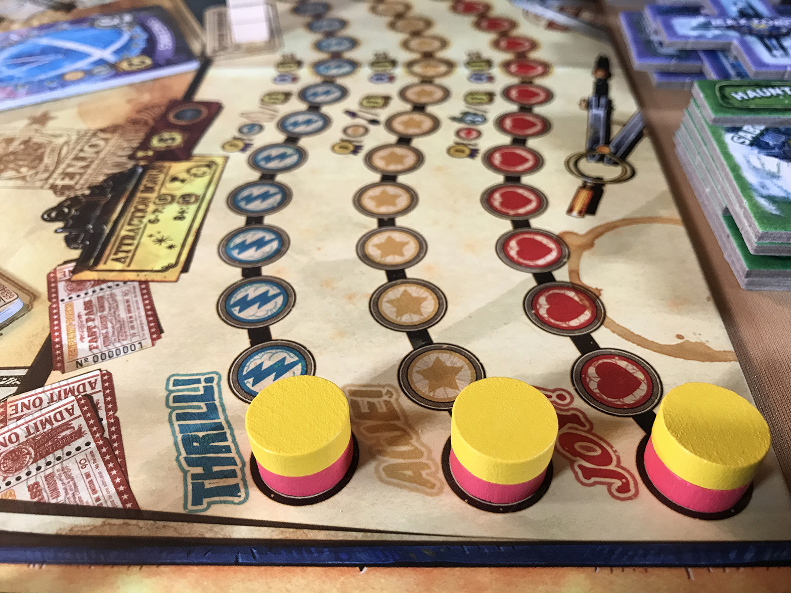 I fiddled around with the board placement a few times to find the best arrangement for solo. The thrill, awe, and joy tracks built away from me, which worked out well.