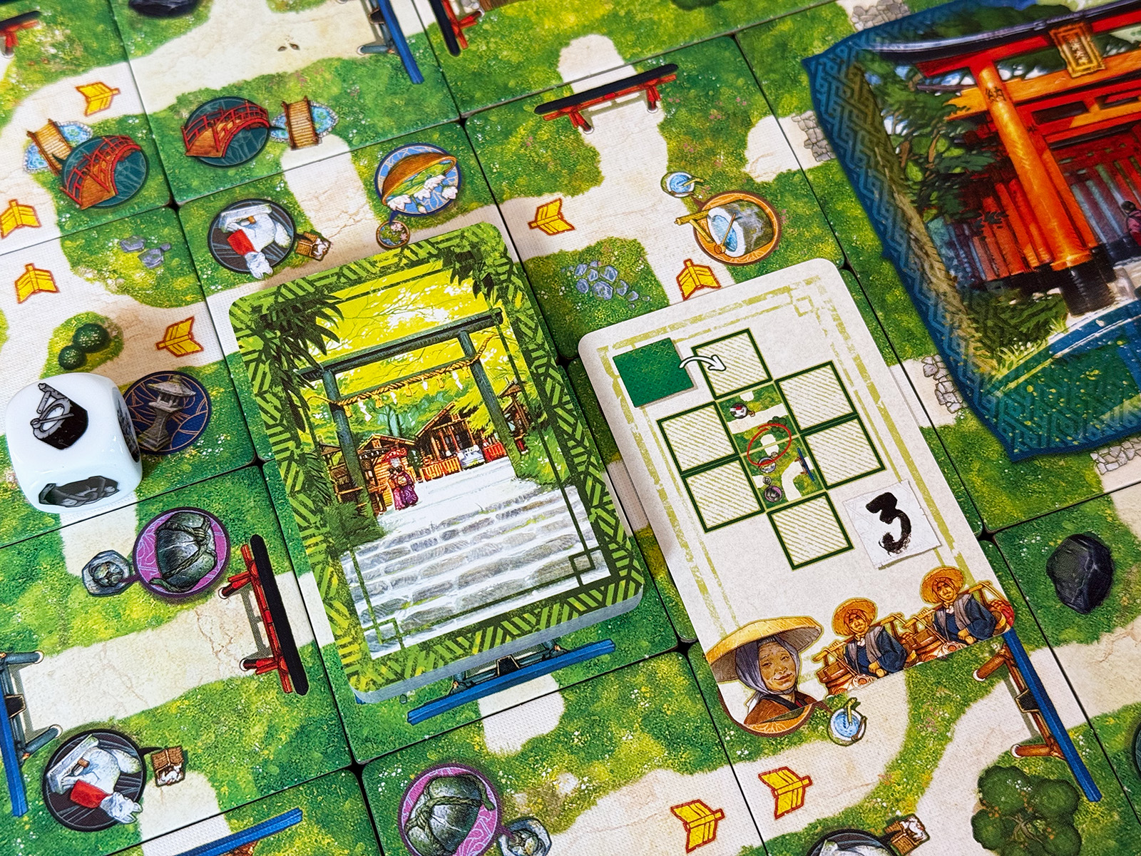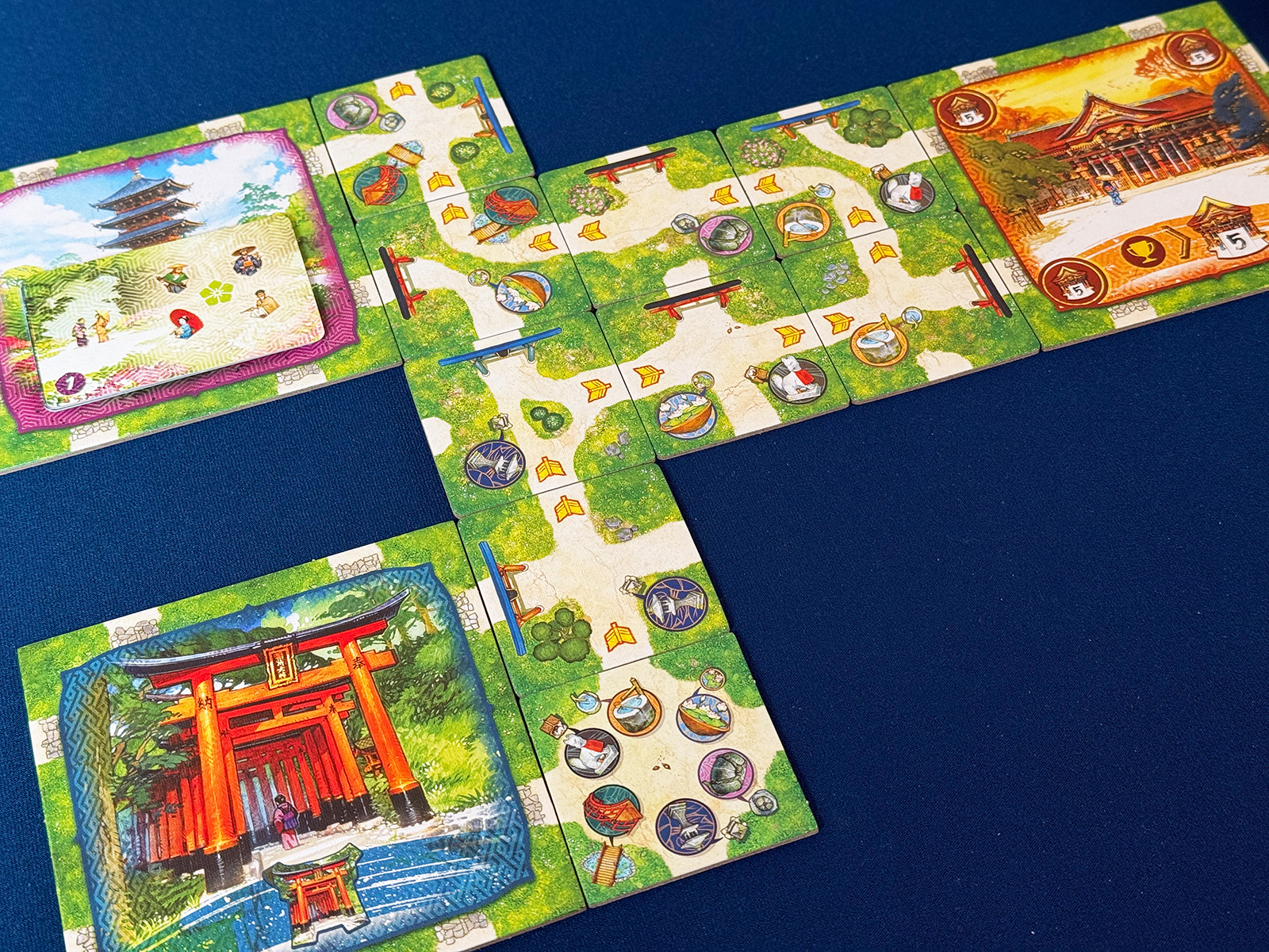 Maximum shrines! In the solo mode, only 3 of 4 may be used with the way the tiles go above Onatsu’s board. But this is still plenty to work with, and I loved the starting paths.