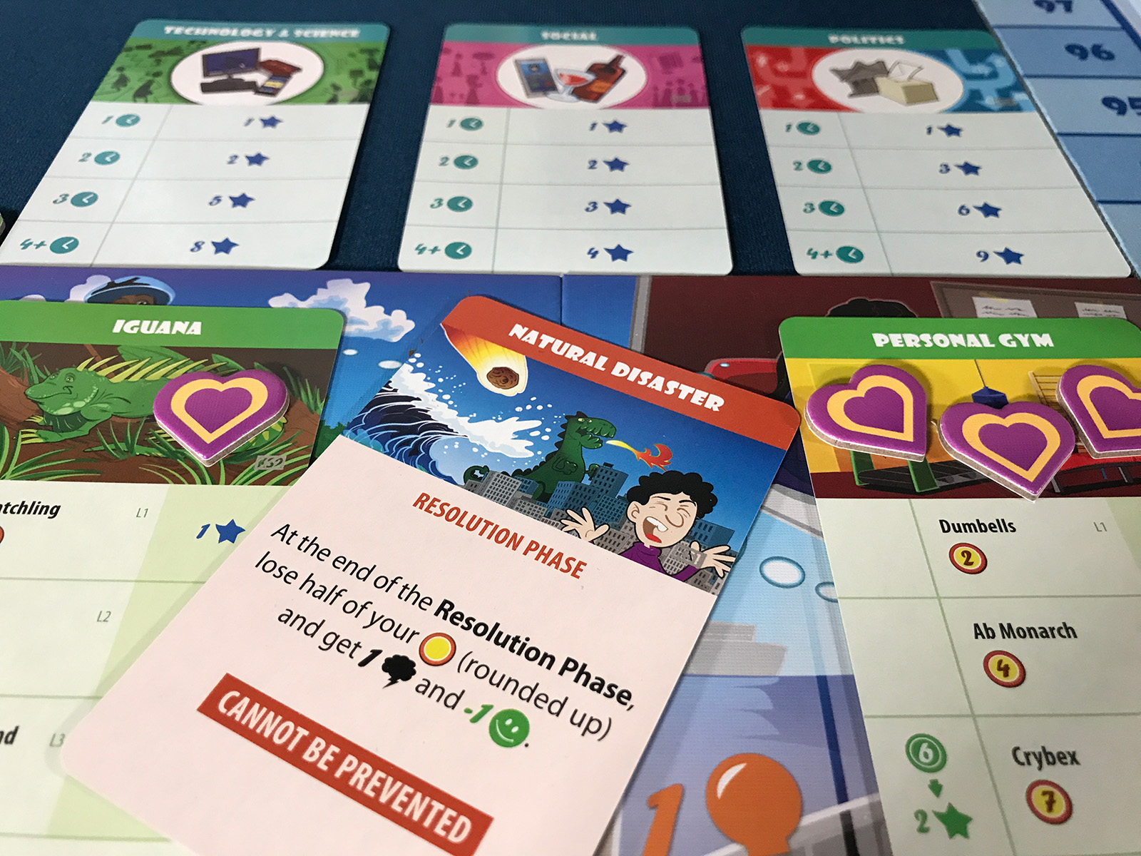 There were some close calls with the solo life goals, but both plays were successful! Kerry might have even pushed ahead further had this awful event not popped up. It’s the only one that can’t be prevented, so he never got a personal gym or iguana. Maybe the iguana WAS the natural disaster… Ha ha! Absolutely love this game!