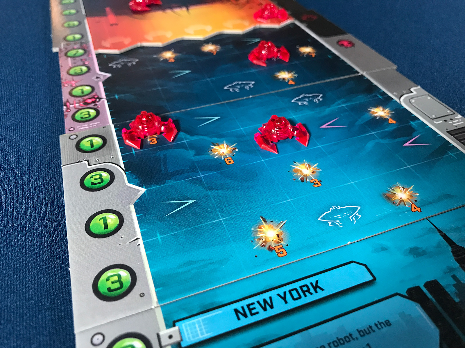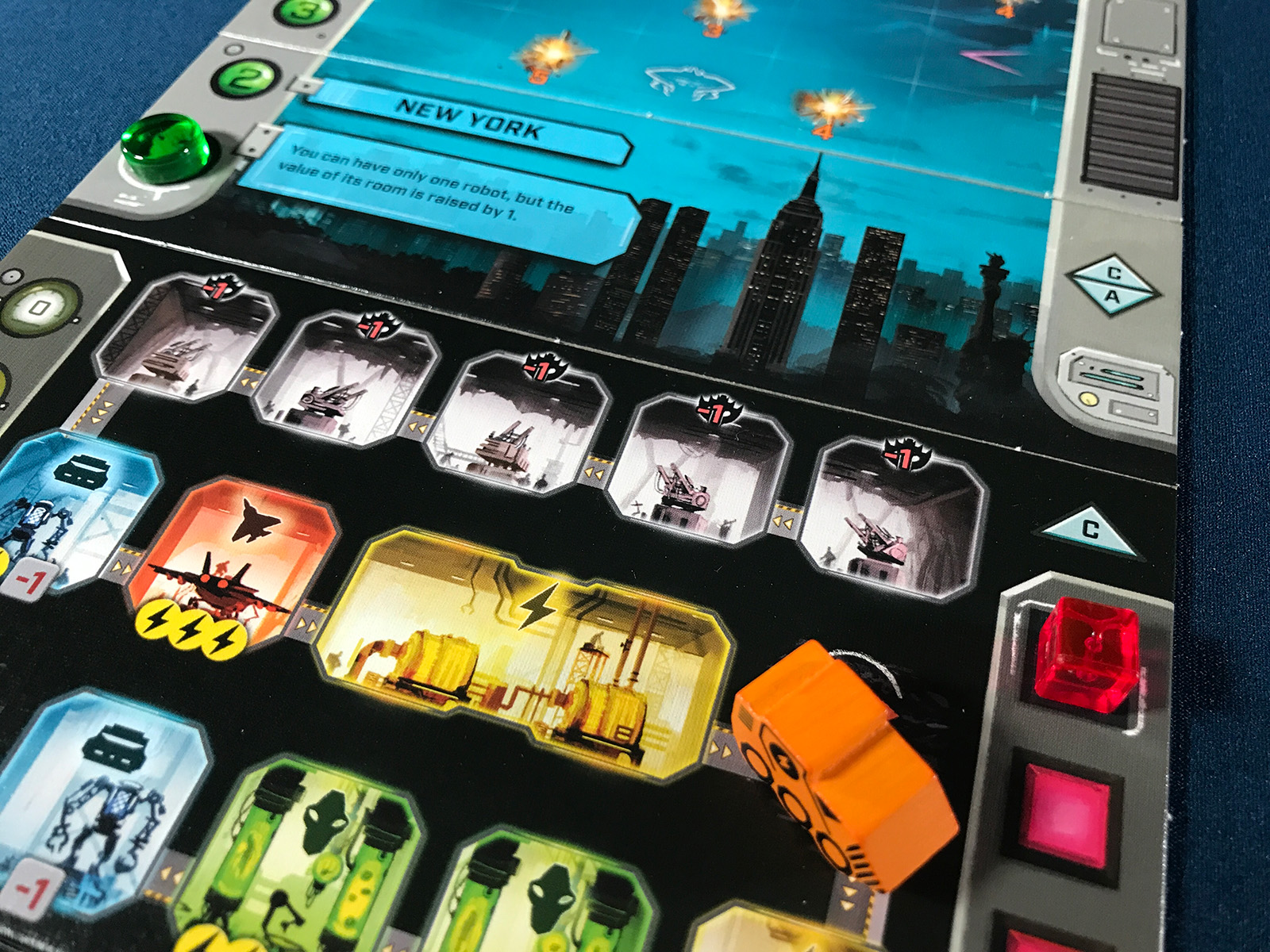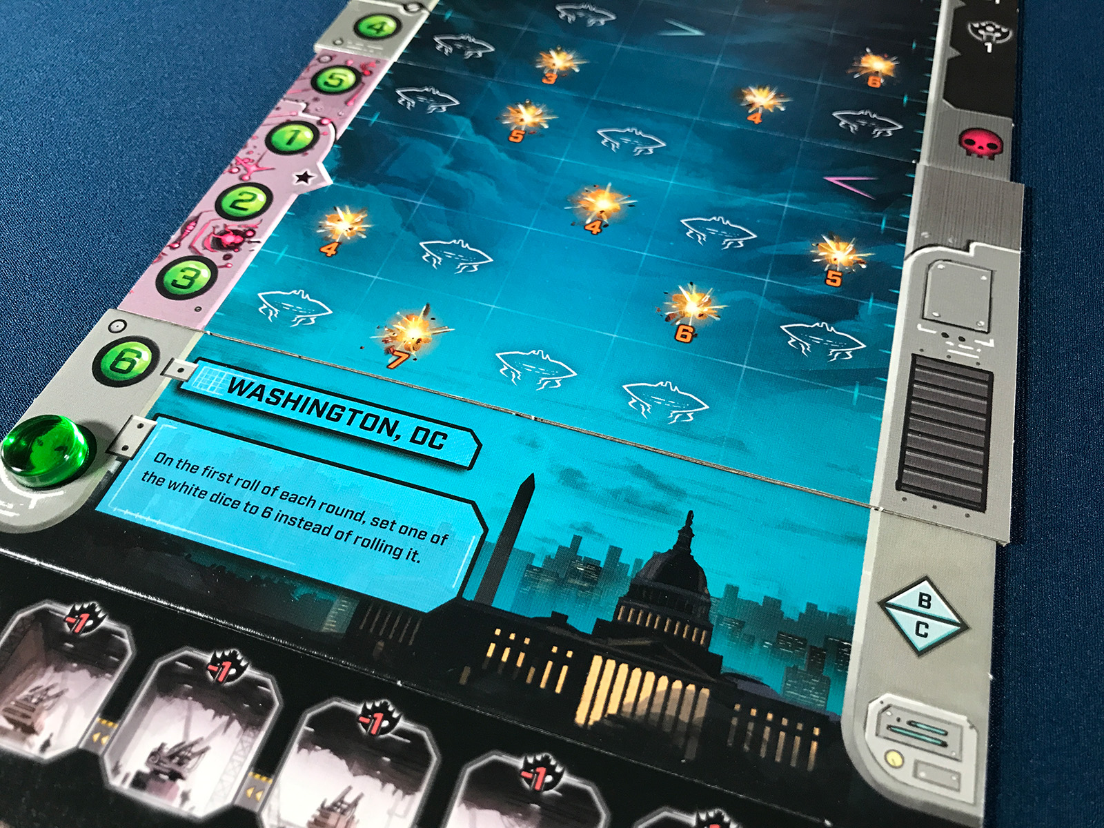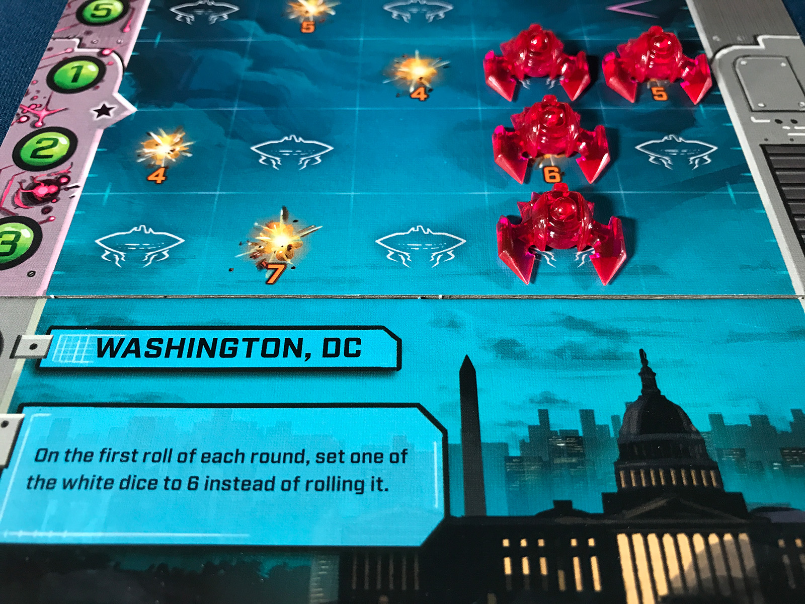 Dice placement is the key strategic element, and every column holds a single die. Values determine the strength of each room, but also control how quickly alien ships move towards the city. Research must progress at a steady pace while protecting the city itself remains a priority!