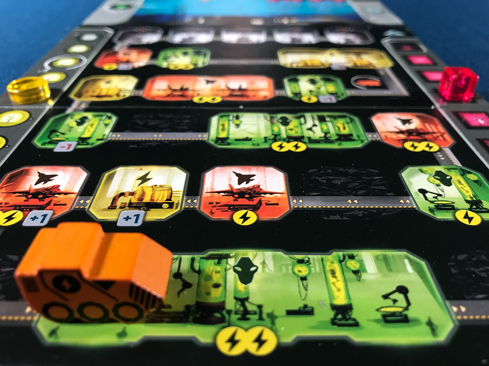 During my first play, I made a bit of a mistake with the overall strategy. Rather than focus on research, I tried to destroy ships whenever possible on the explosion spaces.