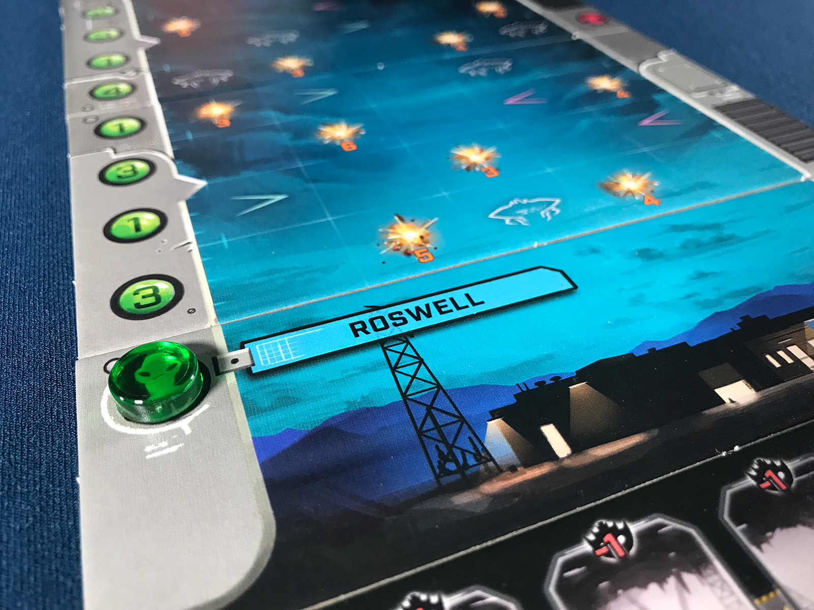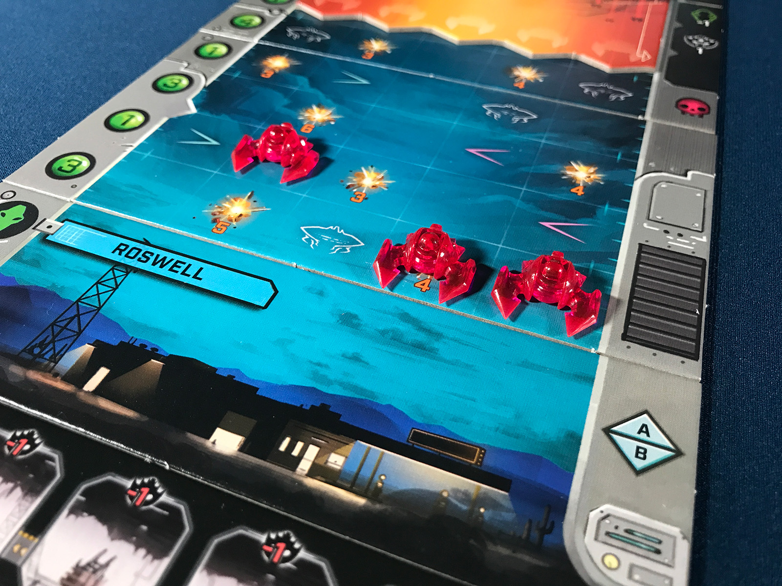 The sky is falling! The sky is falling! … It gets about as close to happening with Under Falling Skies, which I picked up ages ago and finally brought to my solo table. Although not too complex, there is enough going on to make fighting off the alien invasion rather difficult. The iconic play area was soon ready to go, and off I went to save the city of Roswell!