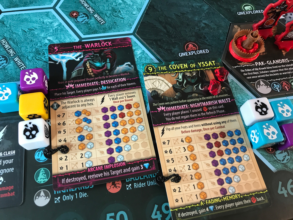 Played over the course of 4 chapters, hexes may be explored as a pair of enemy factions marches closer and closer. Armies and battles play a crucial element, yet each faction’s leader has special abilities and a way to solve quests for other rewards. Who will prevail? Let’s go!