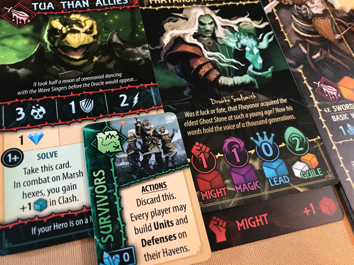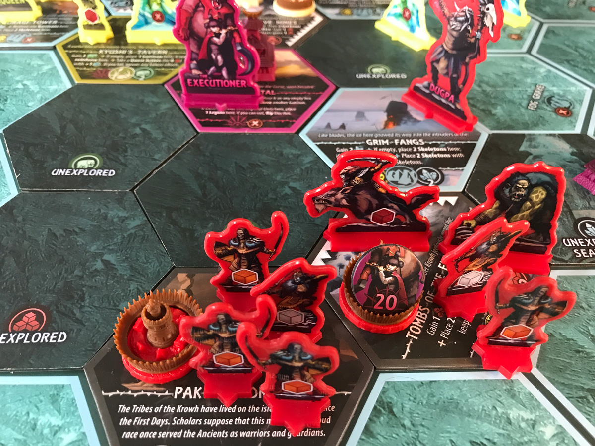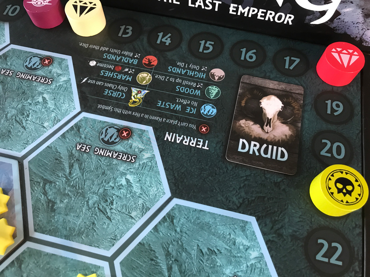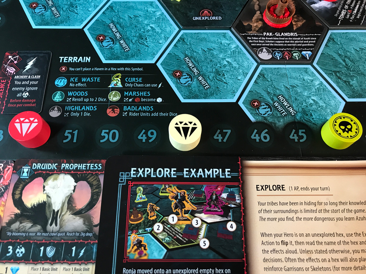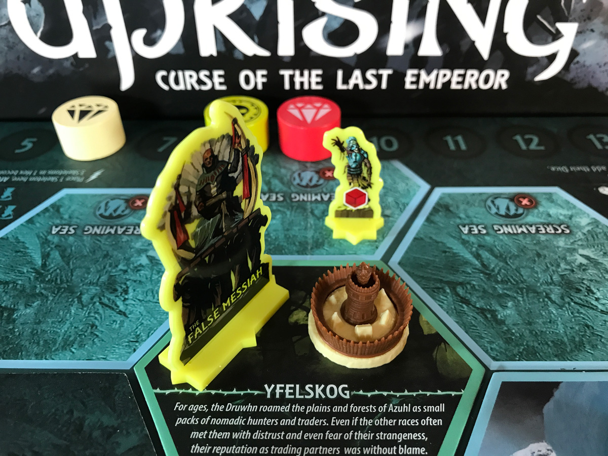 Back to the action in Uprising: Curse of the Last Emperor! I paused after the first chapter, eager to continue on. This cooperative 4X board game offered a lot, though, and I wanted to absorb the rules before I forged onward. My leaders were in good enough spots, yet there was danger in the unknown cold of Azuhl. For the Druwyn and the Krowh!
