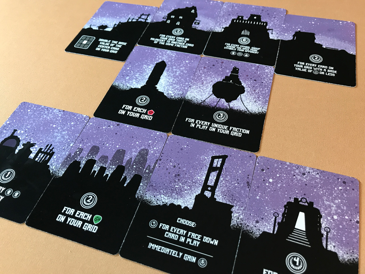 The goal is to score the most victory points against a solo opponent whose goals and extra bonuses aren’t known until the very end. A 3×3 grid of cards often provides special effects for specific arrangements of the different factions. All within a very distinct artistic style!