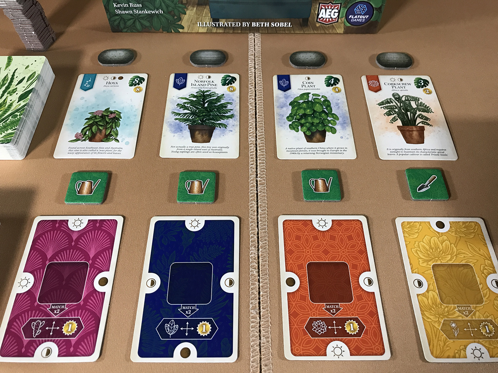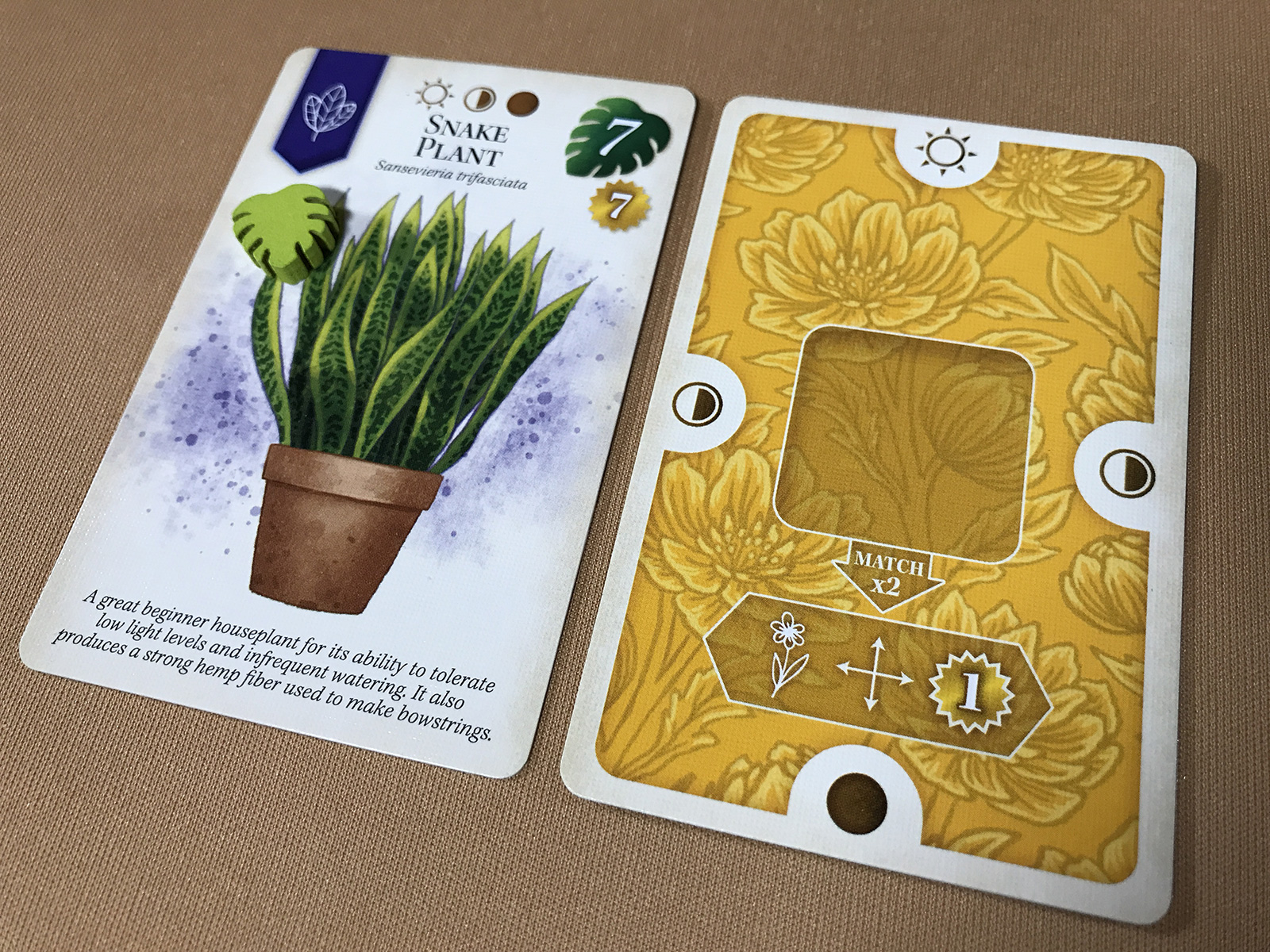 Verdancy, or the green tokens, help complete a plant so that it can be potted. This snake plant needed 7 verdancy in order to score 7 victory points. Easy enough!