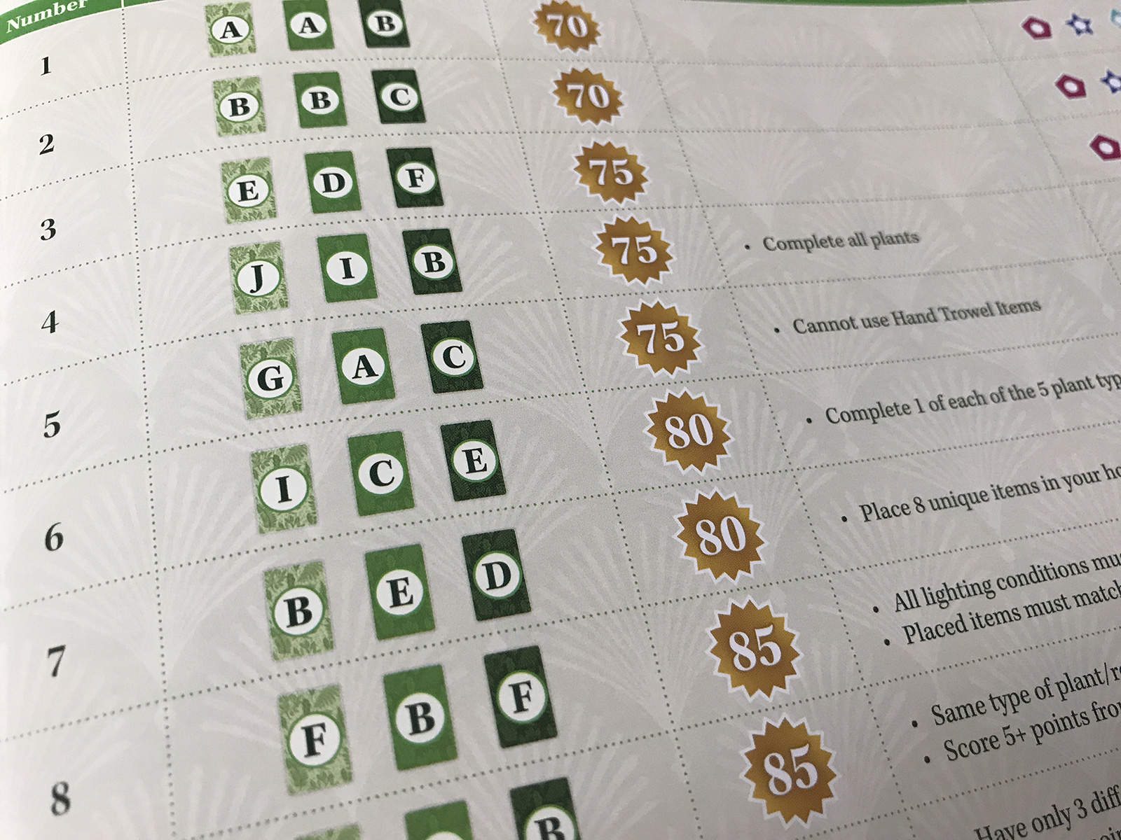Plants and rooms are chosen to create a 3×5 grid to represent a happy little home. Lighting conditions help add verdancy, and reaching the threshold allows a plant to be potted. Objects and tools also help improve scoring conditions, while scenarios add a fun challenge to the mix!
