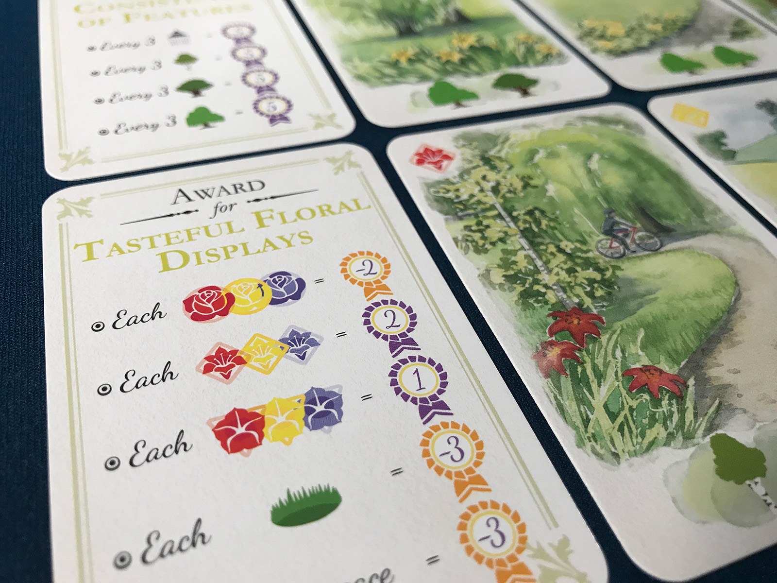 With simple but challenging placement rules, a lovely spot of greenery grows in a 3×3 grid. Surrounded by awards, the columns and rows are evaluated by the unseen committee based on all sorts of criteria. The competitive nature is all but forgotten amidst these picturesque slices of life!