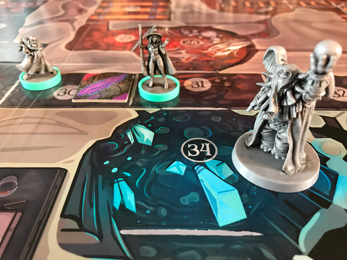 I also agree that all the tiles are hard to see and I have a few things I’ve done to help with that; the first is that I’ve put my minions into coin capsules. This helps raise them above the playing surface a little more and makes them easier to see. The second is that I replace the crystal tile (when revealed) with a large purple crystal instead. Although if I’m going for a crystal strategy, I’ll often want to pick them up right away, I like that it matches better with the base game.