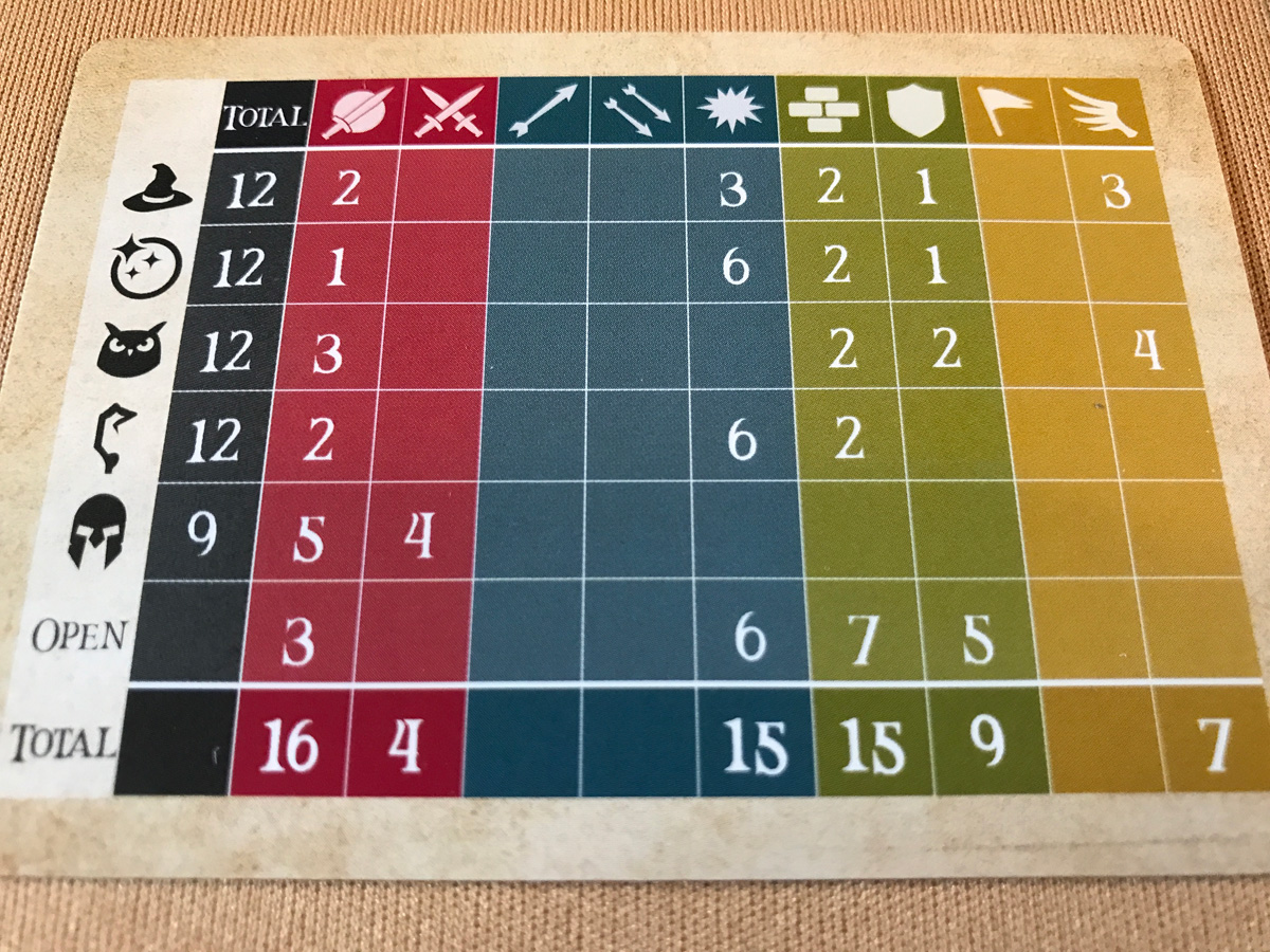 Luckily, this isn’t a complete unknown. Each scenario has a handy reference chart to show the likelihood of a certain type of defense showing up. So very useful!